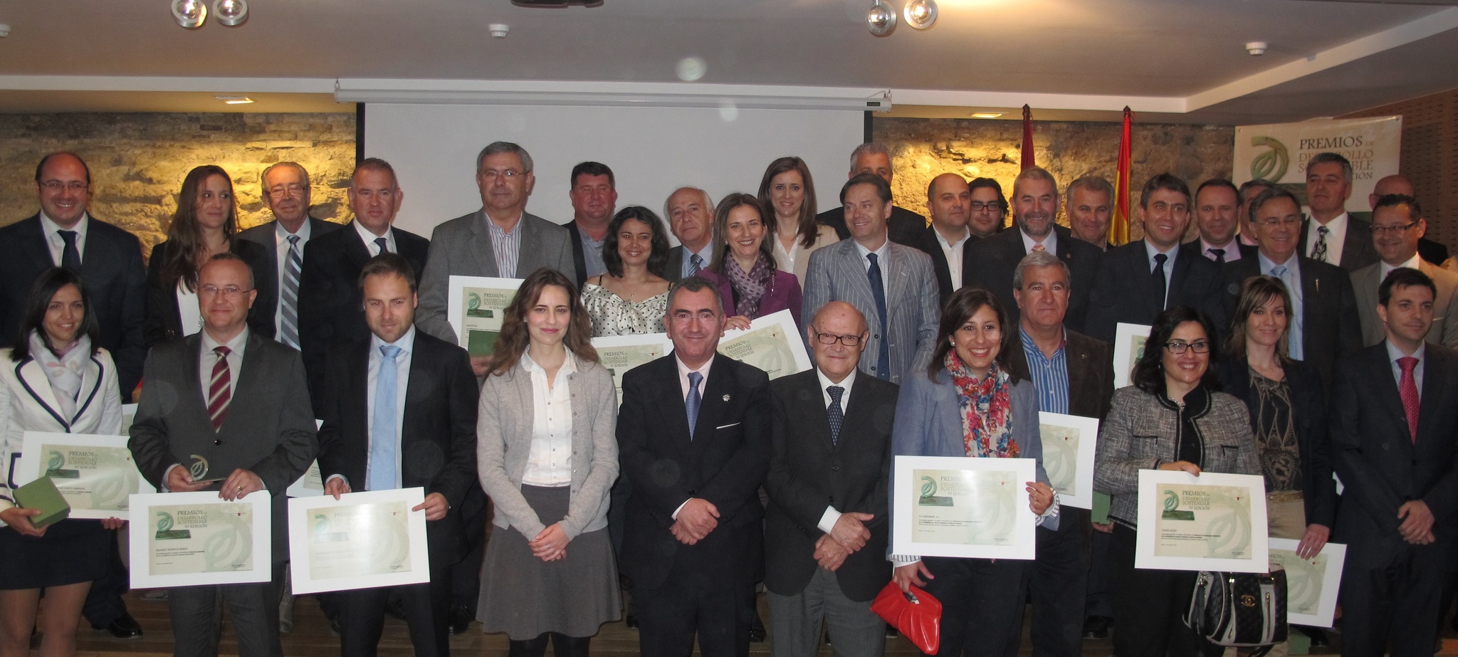 El consejero de Presidencia, Manuel Campos, la secretaria general de la Consejería, Ana Torrente, y el director general de Medio Ambiente, Amador López, junto con los representantes de las empresas, entidades y colectivos que han sido galardonados en el acto de entrega de los 'Premios de Desarrollo Sostenible'.