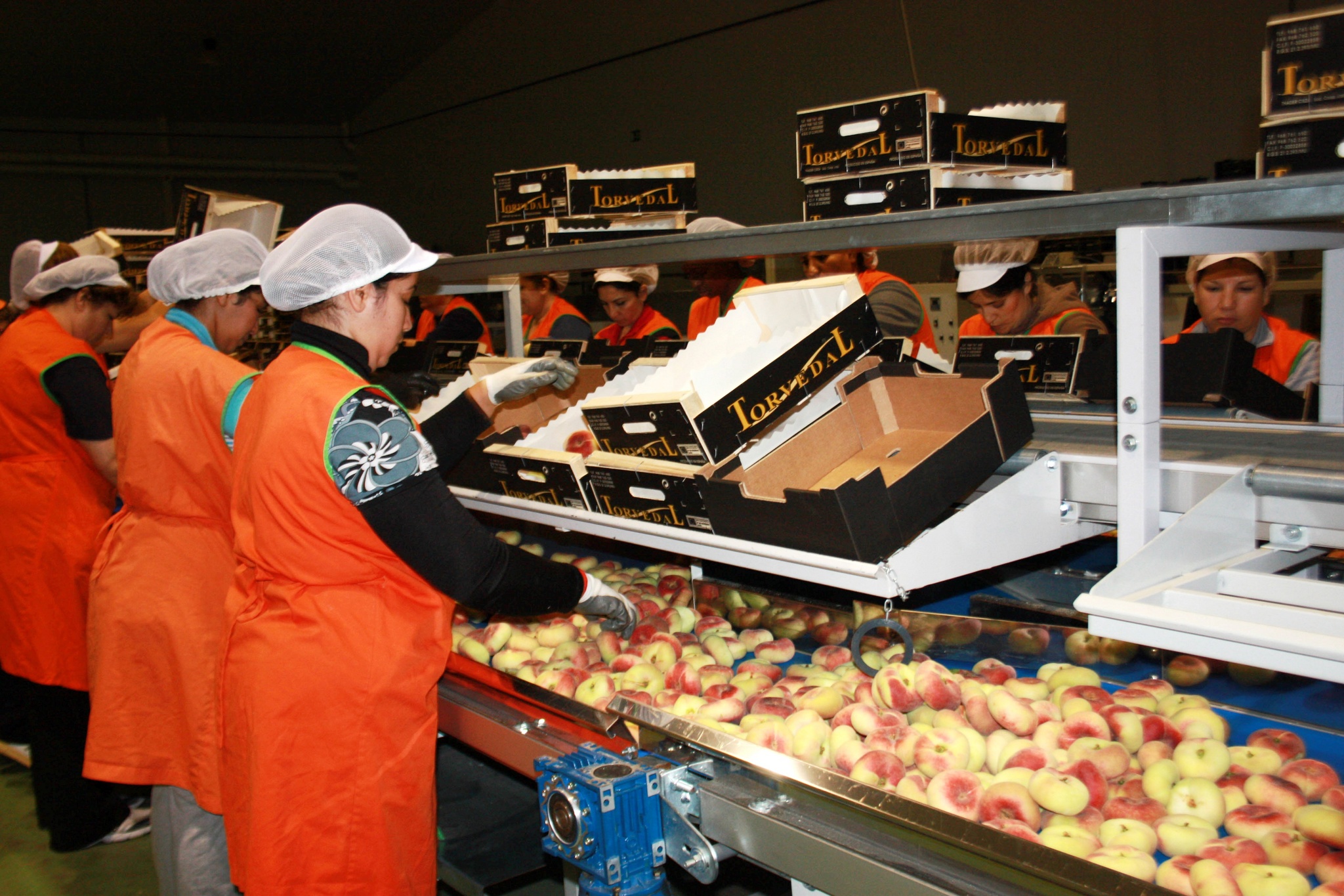Un grupo de trabajadoras en un almacén de confección de productos hortofrutícolas.