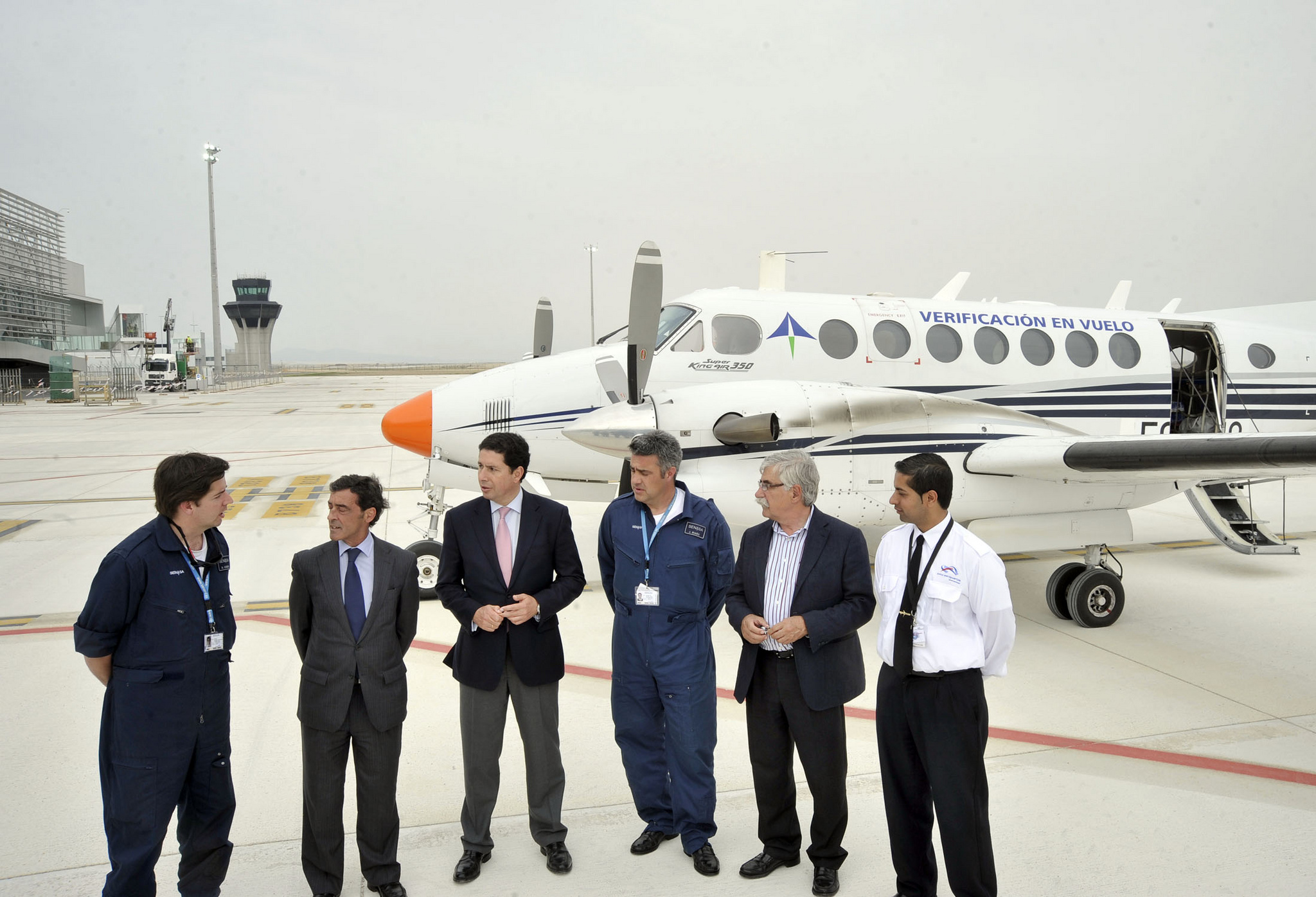 El consejero Antonio Sevilla, junto con los pilotos de AENA que han realizado los vuelos de pruebas en el Aeropuerto Internacional de la Región de Murcia.