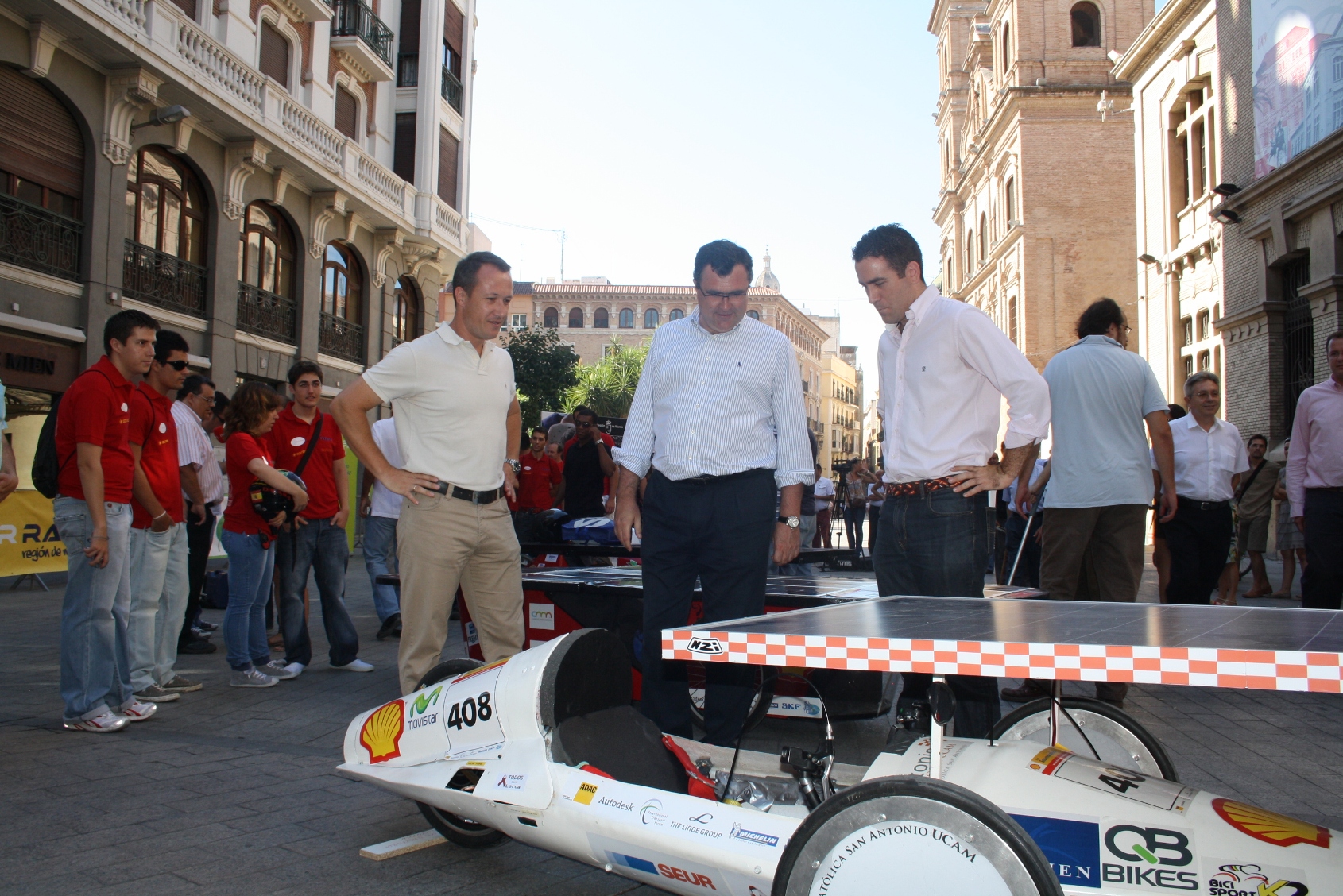 El consejero de Universidades, Empresa e Investigación, José Ballesta, el director de Argem, Teodoro García, y el director de Ingeniería Técnica de Telecomunicación de la UCAM, Rafael Melendreras, con uno de los coches participantes en la Solar Race.
