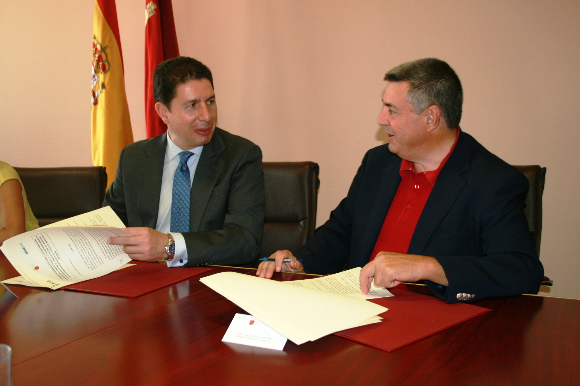 El consejero de Obras Públicas y Ordenación del Territorio, Antonio Sevilla, y el representante de la empresa ALSA en la Región de Murcia, Francisco García, durante la firma del convenio para el fomento del transporte universitario de Cartagena.