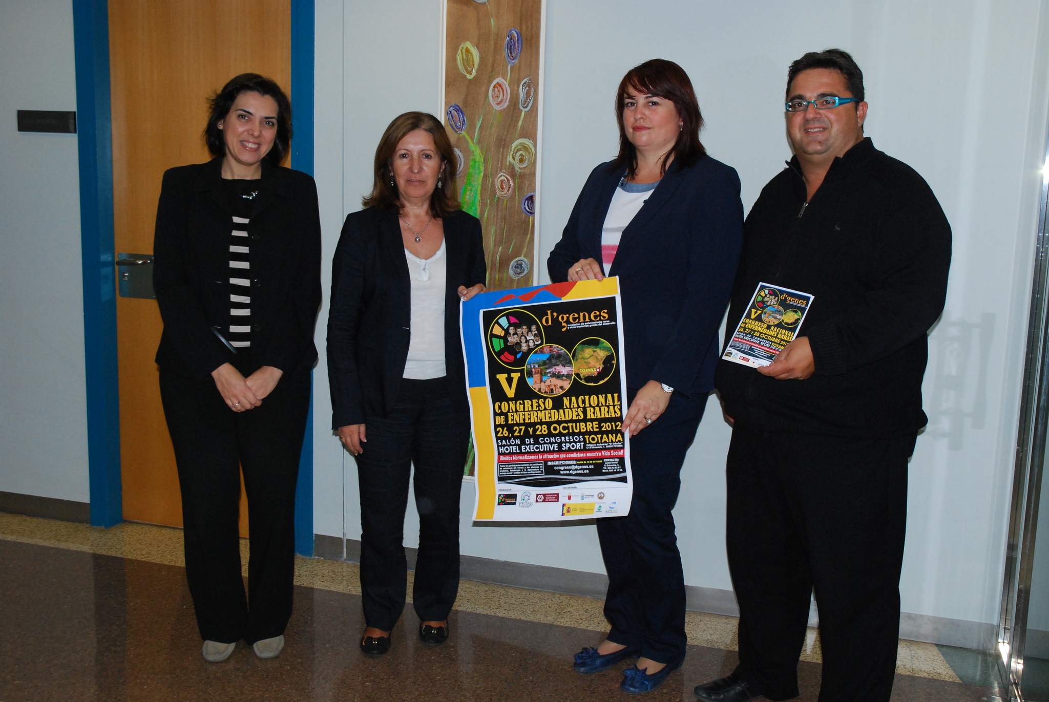 La consejera de Sanidad y Política Social, María Ángeles Palacios (2i), el presidente de la Federación Española de Enfermedades Raras (FEDER), Juan Carrión, la presidenta de D’Genes, Naca Eulalia Pérez de Tudela (2d), y la jefa de la Unidad de Genética Médica del Servicio de Pediatría del Hospital Universitario Virgen de la Arrixaca, Encarna Guilén, muestran el cartel del V Congreso Nacional de Enfermedades Raras, tras la reunión mantenida sobre este encuentro al que la Consejería ha reconocido su Interés Científico Sanitario.