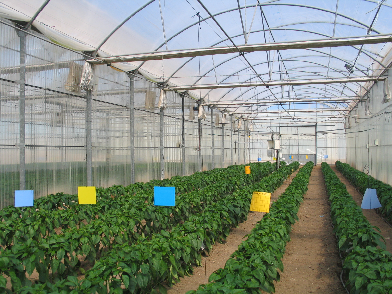 La imagen muestra un invernadero de cultivo de pimiento con sublimadores de azufre.