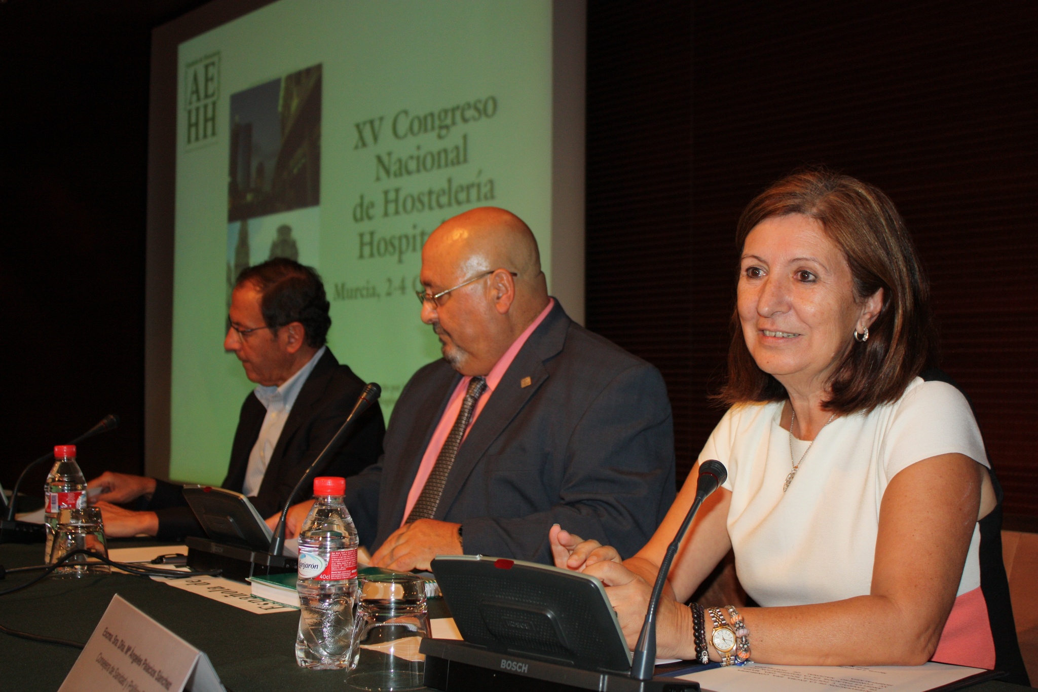La consejera de Sanidad y Política Social, María Ángeles Palacios, junto al alcalde de Murcia, Miguel Ángel Cámara (1i), y el presidente de la Asociación Española de Hostelería Hospitalaria, José Luis Iáñez, durante la inauguración del XV Congreso de Hostelería Hospitalaria que se celebra en Murcia hasta el próximo 4 de octubre.