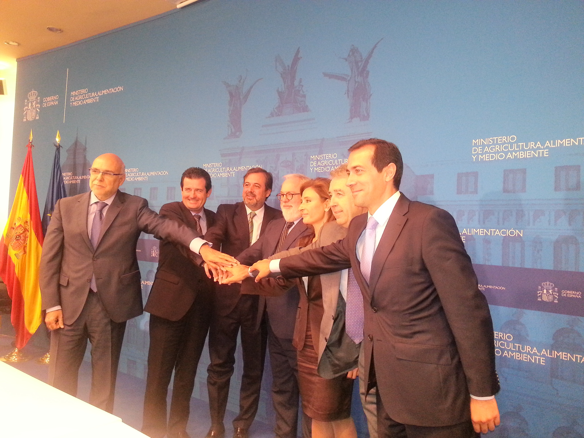 Firma del acuerdo sobre el Memorándum del trasvase Tajo-Segura. En la imagen (de izqda a derch): El consejero de Agricultura, Desarrollo Rural, Medio Ambiente y Energía de Extremadura, José Antonio Echávarri; el vicepresidente de la Generalitat Valenciana, José Císcar; el secretario de Estado de Medio Ambiente, Federico Ramos; el ministro de Agricultura, Miguel Arias Cañete; el consejero de Agricultura y Agua de Murcia, Antonio Cerdá; la consejera de Fomento de Castilla La Mancha, Marta García, y el consejero de Presidencia, Justicia y Portavoz del Gobierno de la Comunidad de Madrid, Salvador Victoria.