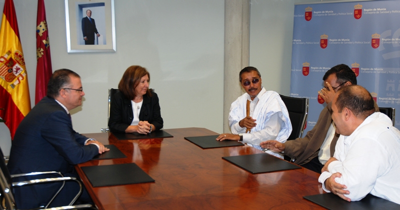 La consejera de Sanidad y Política Social, María Ángeles Palacios (c), y el director general de Política Social, Leopoldo Navarro (i); mantuvieron una reunión con el presidente del parlamento de la República Árabe Saharaui Democrática, Jatri Aduh (3d), y con el delegado saharaui en la Región de Murcia, Mohamed Labat Mustafa (1d). En este encuentro, se abordaron diversos aspectos sobre la colaboración entre ambos pueblos y los representantes saharauis se mostraron agradecidos por el trabajo conjunto que desde hace años desarrolla el Ejecutivo autonómico en el Sahara Occidental.