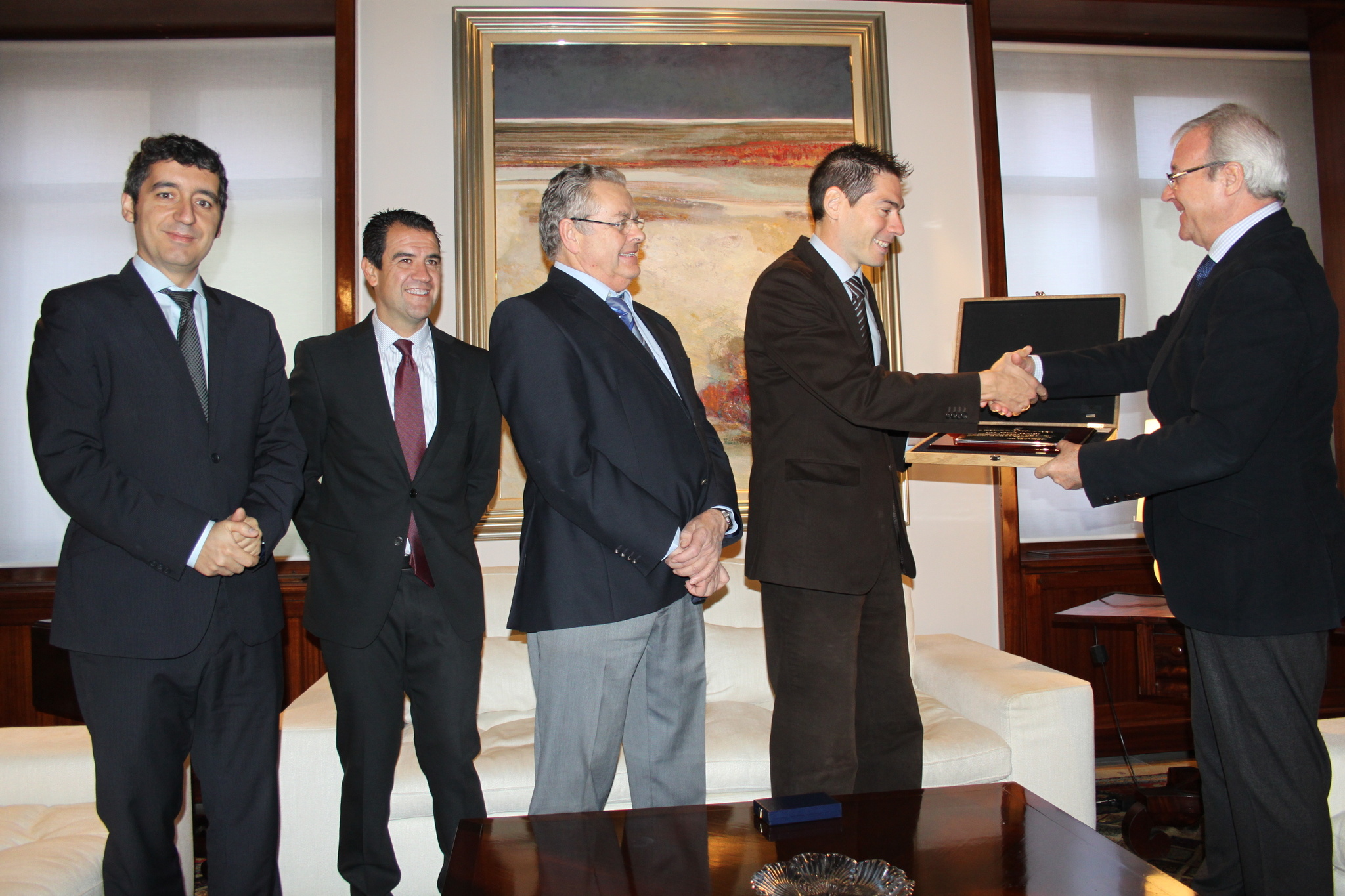 El jefe del Ejecutivo murciano recibe al jugador de fútbol sala Kike Boned, al que entrega una placa en reconocimiento a su trayectoria profesional en este deporte