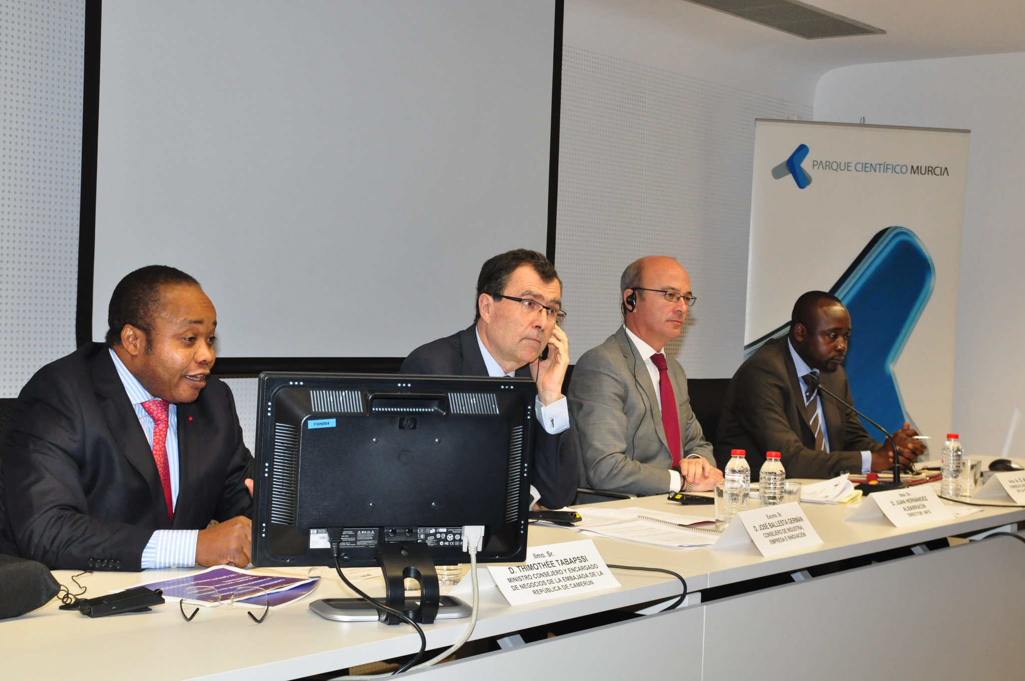 El consejero de Industria, Empresa e Innovación, José Ballesta, inauguró hoy la jornada ‘África, más allá de los BRIC’, destinada a mostrar las opciones de negocio que representan países emergentes de África subsahariana como Camerún,la República del Congo, Guinea Ecuatorial, Gabón yla Repúblicadel Chad. En la imagen aparece junto al consejero encargado de negocios de la Embajada de la República de Camerún, Thimothée Tabapssi (1i), el director del Instituto de Fomento, Juan Hernández (2d), y el consejero de la Embajada de la República del Congo, Alexis Ekaba.
