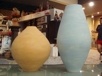 Medidas: 48 cm. y 33 cm., respectivamenteTécnicas: modelado por rollo, aplicación de engobes con paletina y cocciónMateriales: gres blanco, engobes azul turquesa y naranja.
