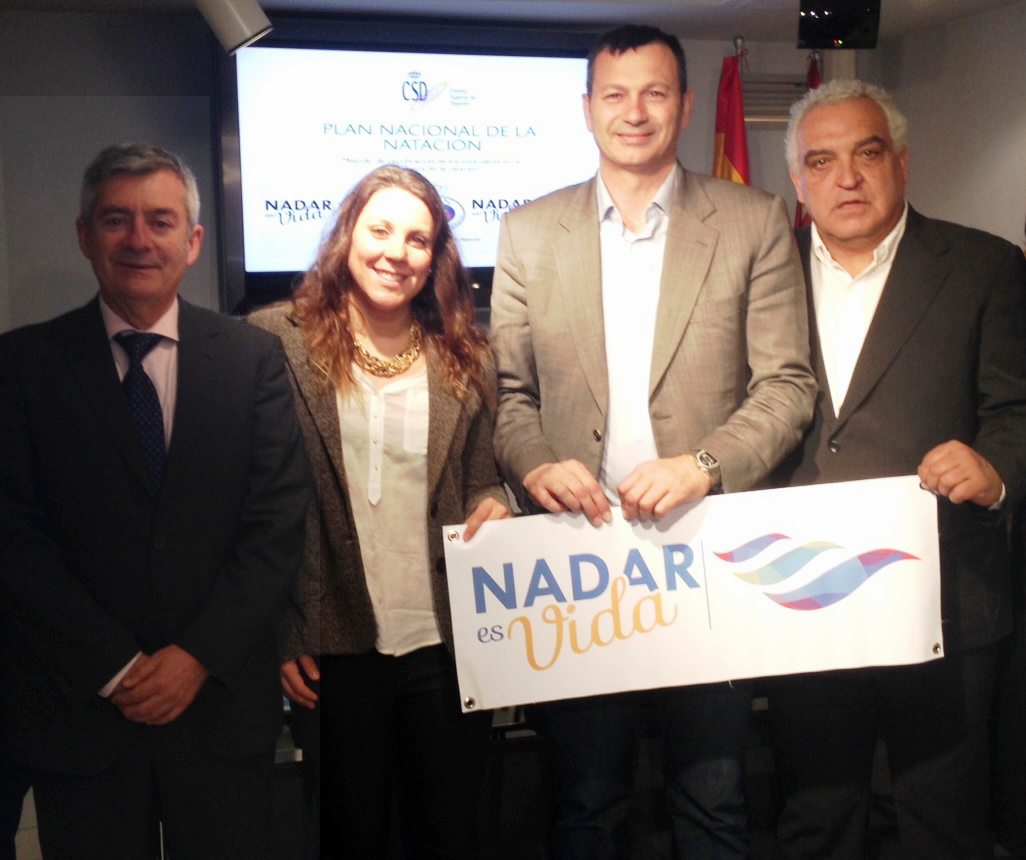 El director general de la Actividad Física y el Deporte, Antonio Peñalver, el presidente de la Real Federación Española de Natación, RFEN, Fernando Carpena, el presidente de la Federación de Natación de la Región de Murcia, Francisco Domínguez, y la nadadora Margarita Domínguez, durante la presentación del Plan Nacional de Natación 'Nadar es Vida'.