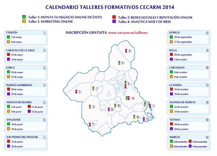 Calendario de los talleres gratuitos de Cecarm (Comercio Electrónico, Factura Electrónica y Marketing Digital).