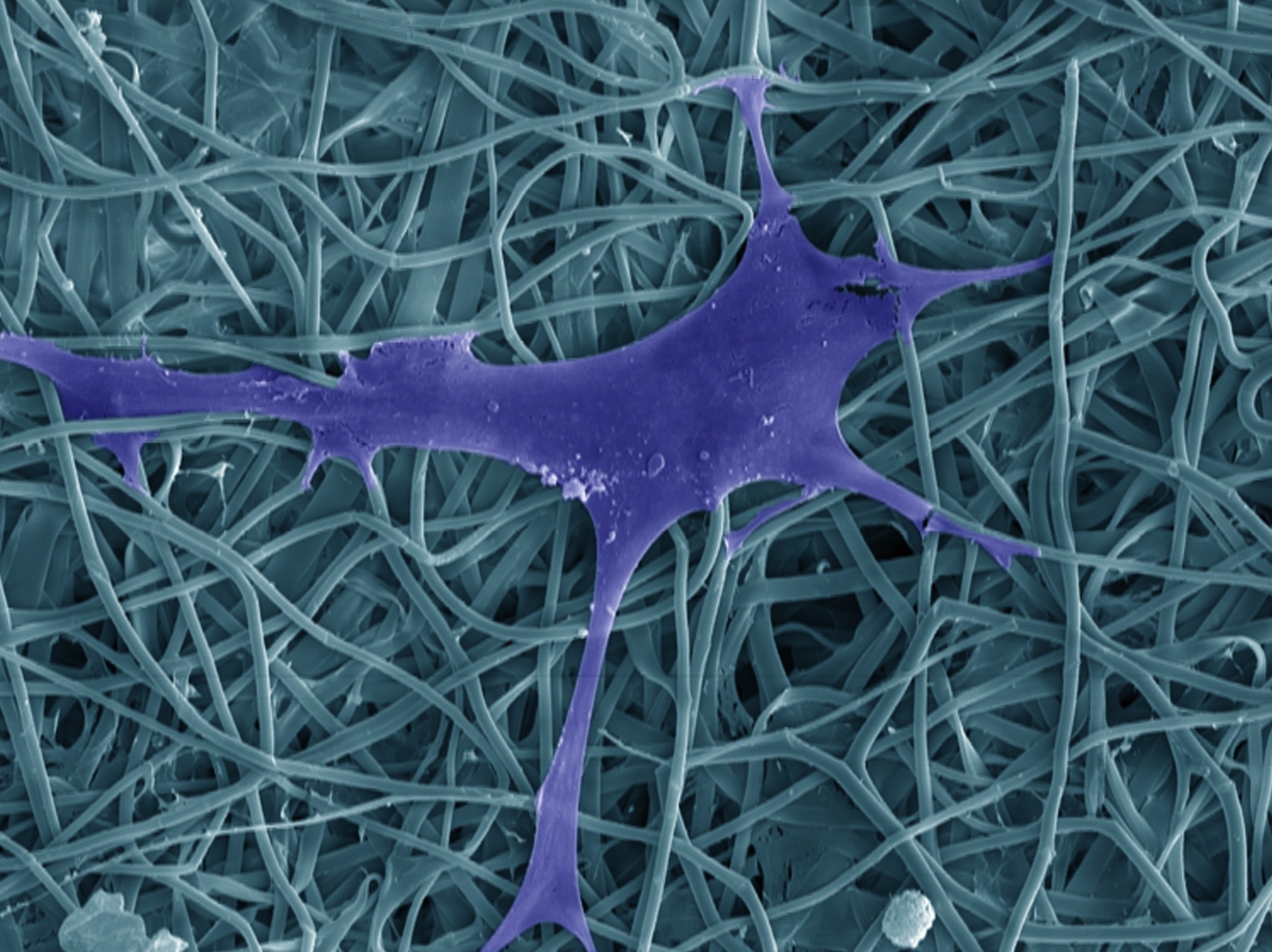 La imagen muestra una célula mesenquimal humana creciendo en una malla de nanofibras de fibroína