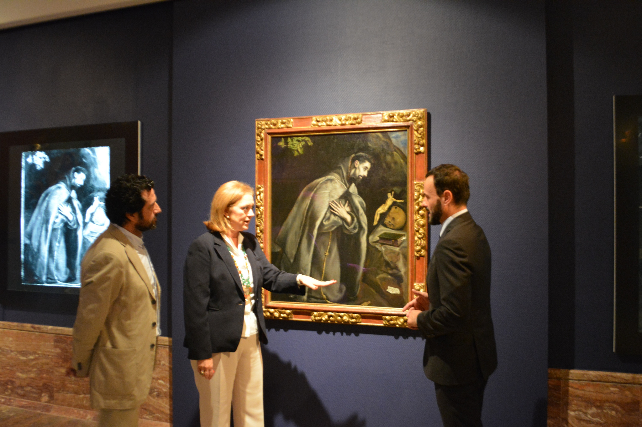 La directora general de Bienes Culturales, María Comas, junto con el jefe de departamento de Conservación y Restauración del Museo de Bellas Artes de Bilbao, José Luis Merino, en la presentación de la exposición del cuadro de El Greco ‘San Francisco en oración ante el Crucificado’.