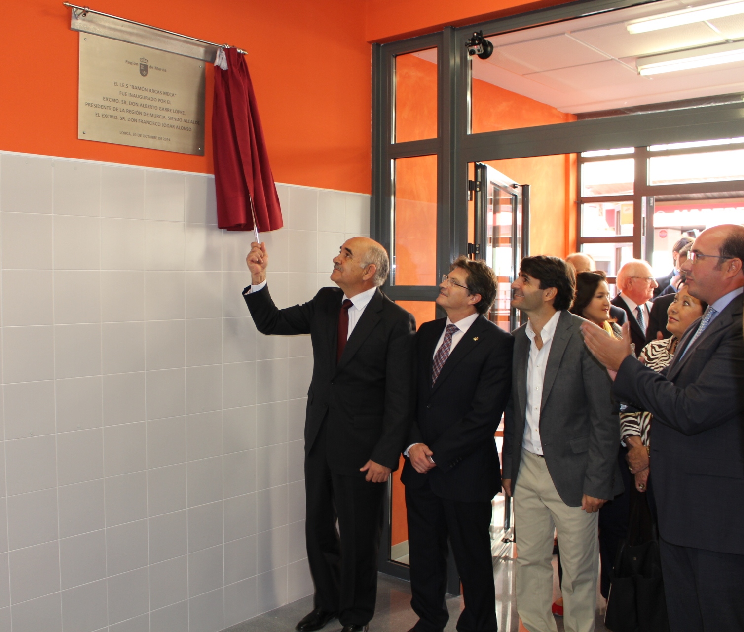 El presidente de la Comunidad, Alberto Garre, inauguró hoy en Lorca las nuevas dependencias del IES Ramón Arcas Meca, que reemplazan a las del antiguo inmueble que fueron demolidas a causa de los daños provocados por los terremotos de mayo de 2011. El jefe del Ejecutivo regional recorrió las nuevas instalaciones acompañado por el alcalde de Lorca, Francisco Jódar, el consejero de Educación, Cultura y Universidades, Pedro Antonio Sánchez, y el director del centro educativo, Juan Antonio López.
