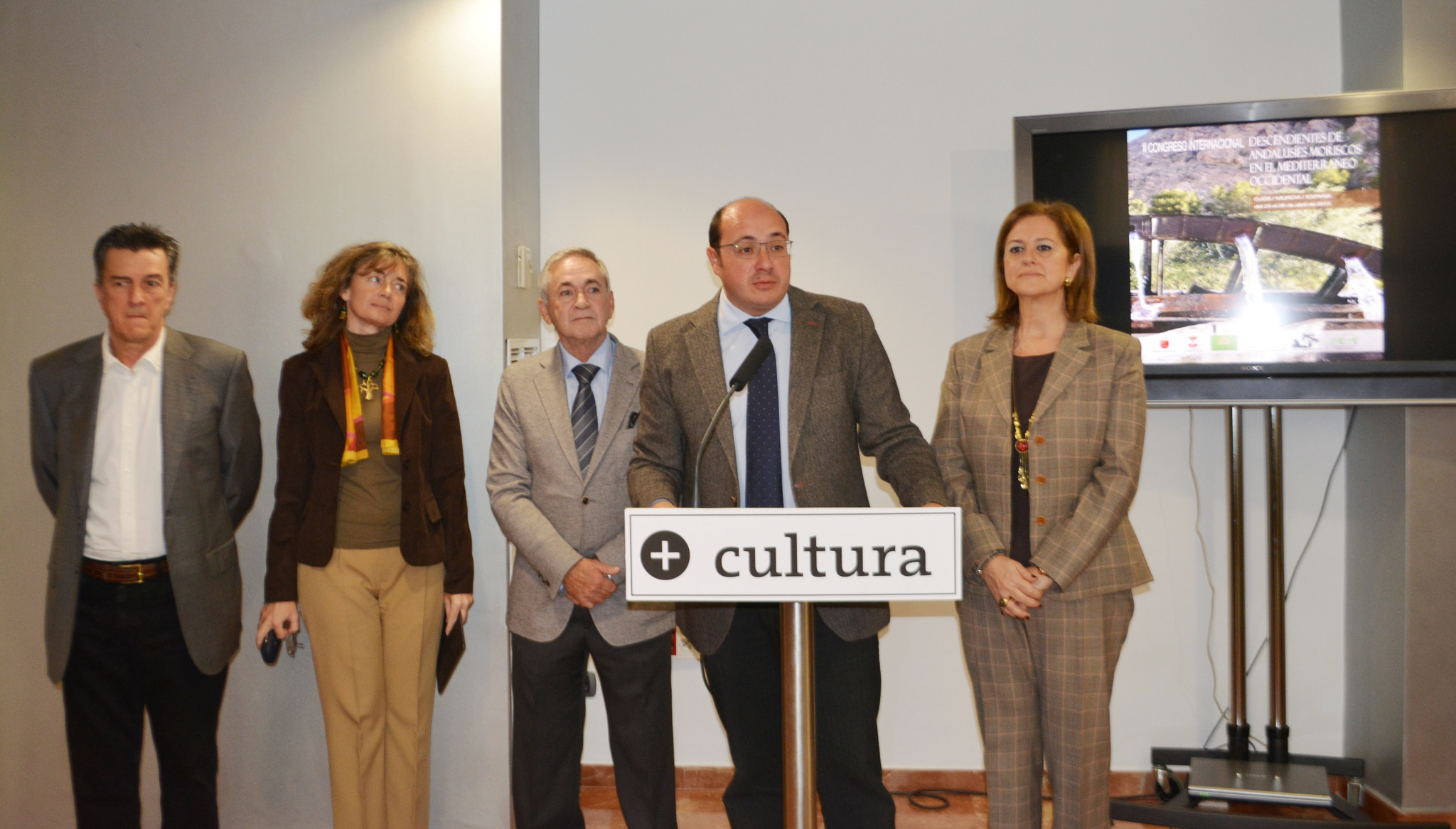 El consejero de Educación, Cultura y Universidades, Pedro Antonio Sánchez, junto con el alcalde de Ojós, Pablo Melgarejo, la directora general de Casa Mediterráneo, Almudena Muñoz y el investigador y responsable de la Asociación Cultural Oxox, Buenaventura Buendía, durante la presentación del II Congreso Internacional ‘Descendientes de andalusíes moriscos en el Mediterráneo Occidental’