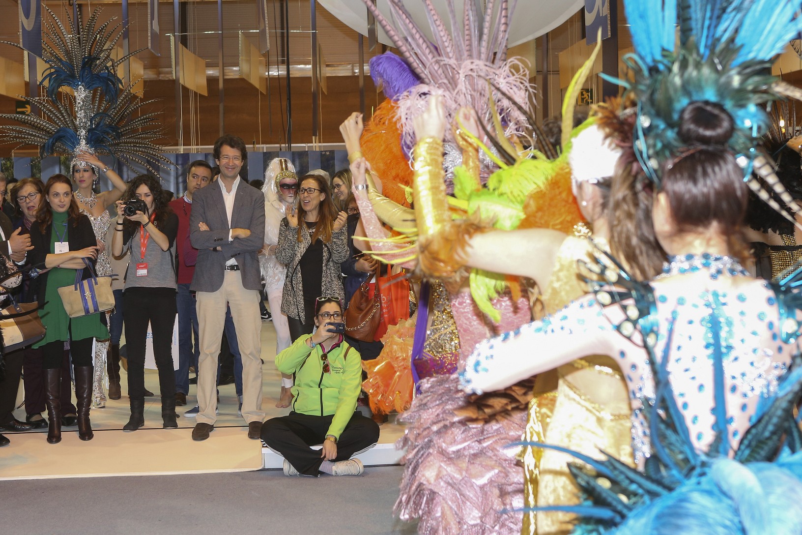 El consejero de Turismo, Juan Carlos Ruiz, disfruta del espectáculo que ofreció en Fitur el cuerpo de baile del Carnaval de Águilas.