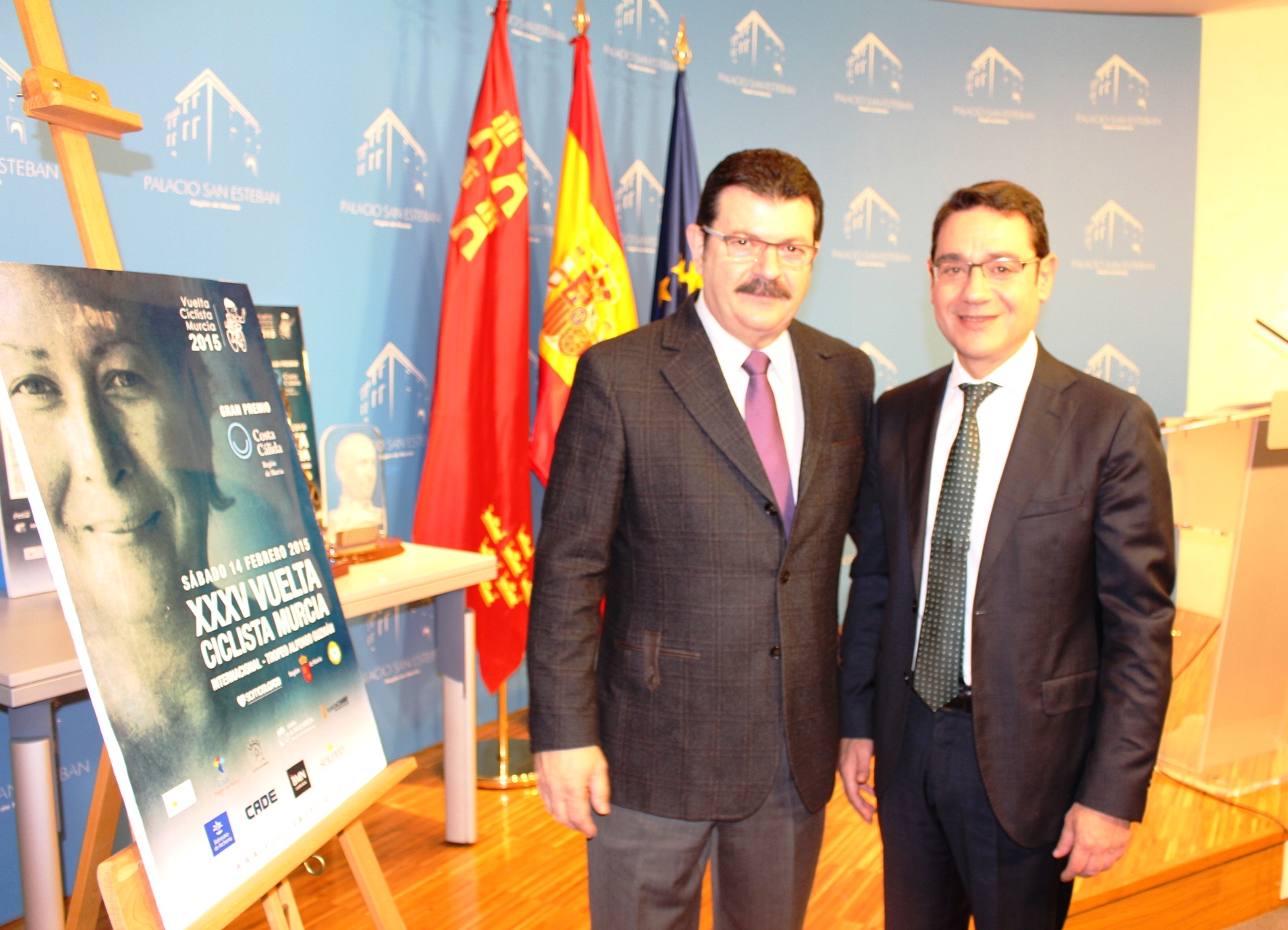 El consejero de Presidencia y Empleo, José Gabriel Ruiz, y el presidente de la Vuelta Ciclista a la Región de Murcia, Francisco Guzmán, posan con el cartel de la XXXV Vuelta Ciclista a la Región de Murcia Internacional ‘Costa Cálida’-Trofeo Alfonso Guzmán.