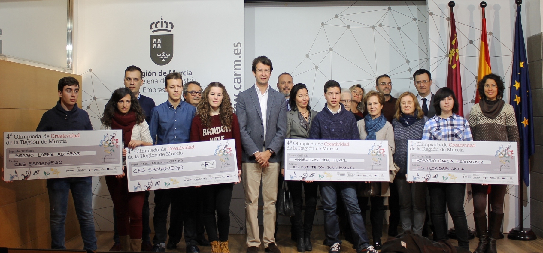 Los alumnos que obtuvieron las máximas puntuaciones en las pruebas de creatividad que se realizaron en el CEEIM el pasado 6 de noviembre fueron, en el primer puesto, Ángel Luis Pina Terol (IES Infante Don Juan Manuel de Murcia.); en segundo lugar, Sergio López Alcázar (CES Samaniego de Alcantarilla); y en el tercer puesto, Rosario García Hernández (IES Floridablanca de Murcia). Asimismo, el CES Samaniego de Alcantarilla se alzó con el premio al centro más creativo, gracias a los alumnos Lucía Martínez Franco, Laura Munuera Ruipérez, Sergio López Alcázar e Ismael Mestour Martínez, y a su profesor Pablo Riquelme.