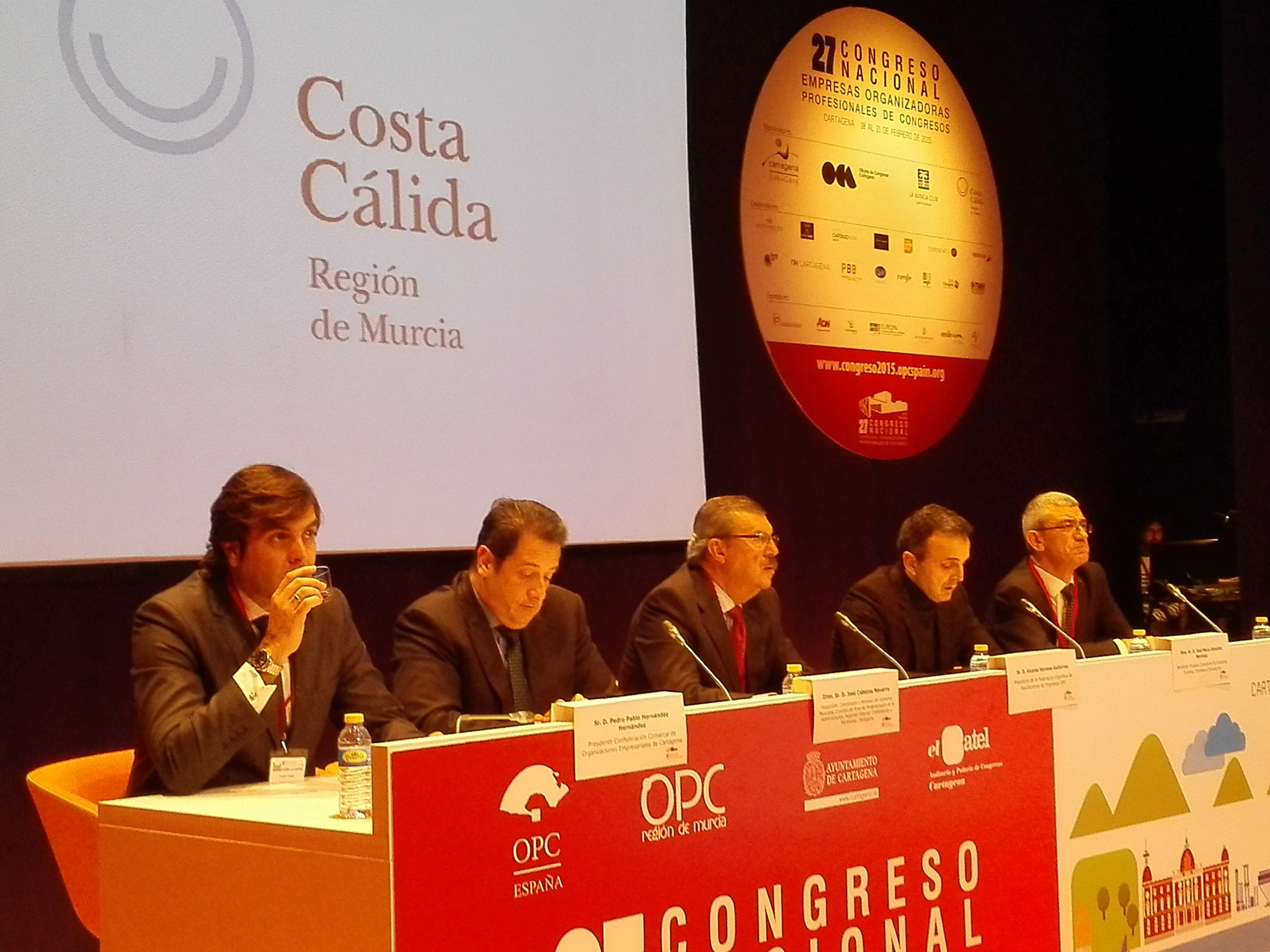 El secretario general de la Consejería de Industria, Turismo, Empresa e Innovación, José María González, inauguró el Congreso Nacional OPC en el Auditorio y Centro de Congresos El Batel de Cartagena, junto al presidente de la Federación Española de Asociaciones de Empresas OPC, Vicente Serrano, el vicealcalde de Cartagena, José Cabezos, el presidente de COEC, Pedro Pablo Hernández, y el presidente de la Asociación de Empresas OPC Región de Murcia, Antonio García.