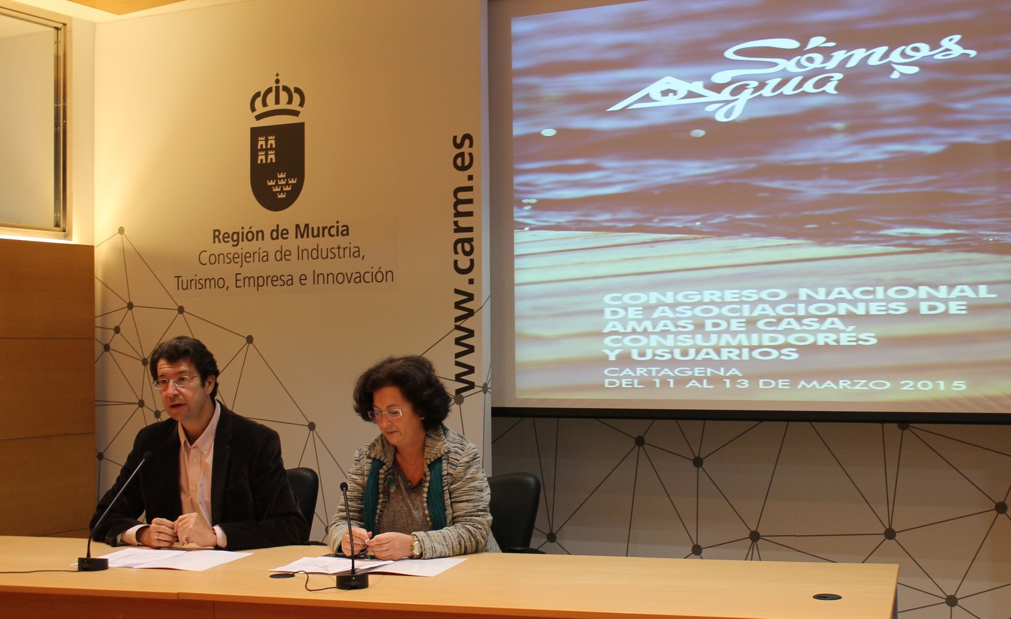 El consejero de Industria, Turismo, Empresa e Innovación, Juan Carlos Ruiz, junto a la presidenta regional de Thader Consumo, Juana Pérez, presentó hoy el Congreso Nacional de Asociaciones de Amas de Casa, Consumidores y Usuarios que se desarrollará en Cartagena entre el 11 y el 13 de marzo bajo el título ‘Somos agua’.