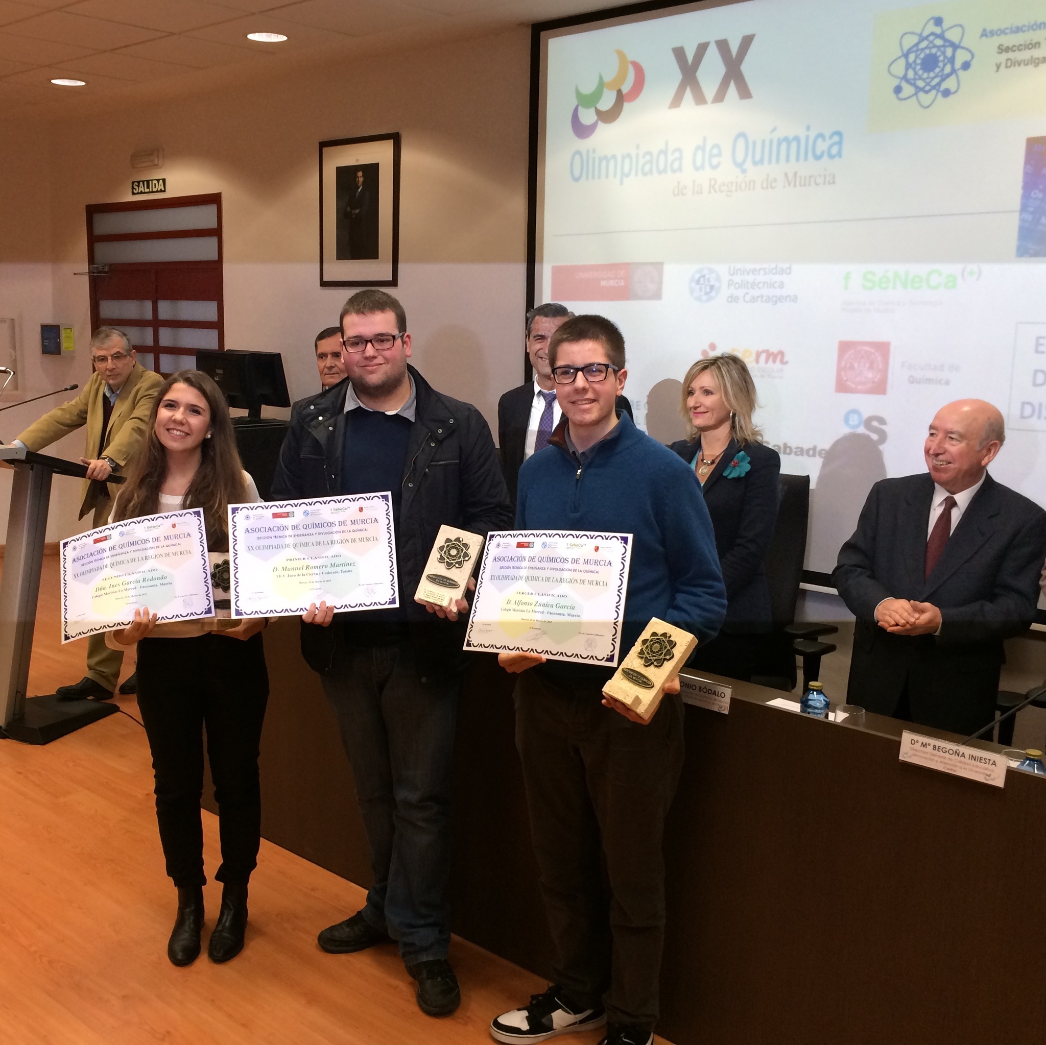 En la primera imagen, los alumnos ganadores de la XX Olimpíada de Química son: Manuel Romero, estudiante del IES Juan de la Cierva y Codorniu de Totana, que ha obtenido el primer premio; mientras que el segundo y el tercer premio han correspondido a Inés García y Alfonso Zúnica, respectivamente, del Colegio Maristas La Merced-Fuensanta de Murcia. El ganador de esta edición representará a la Región de Murcia en la Olimpiada Nacional de Química, que se celebrará el 18 de abril en Madrid.