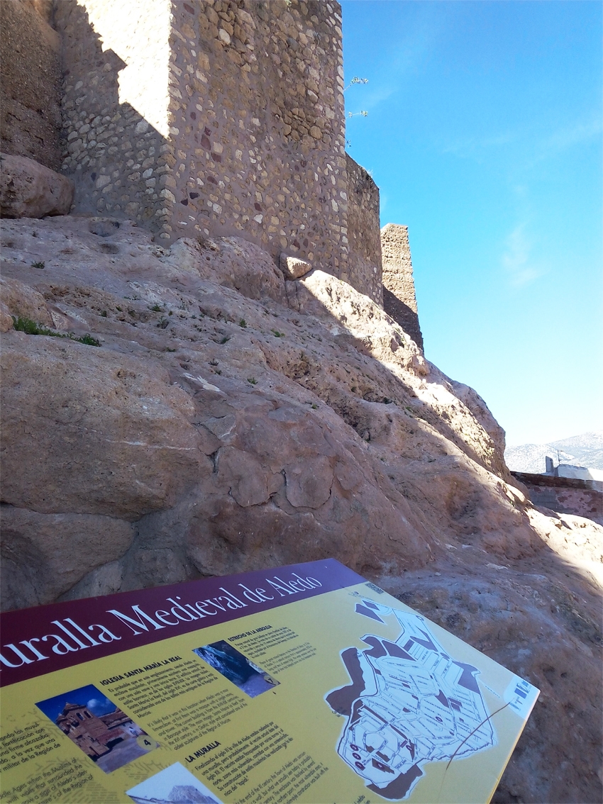 Panel informativo instalado junto a la muralla medieval de Aledo para proporcionar al visitante datos sobre la historia del municipio.