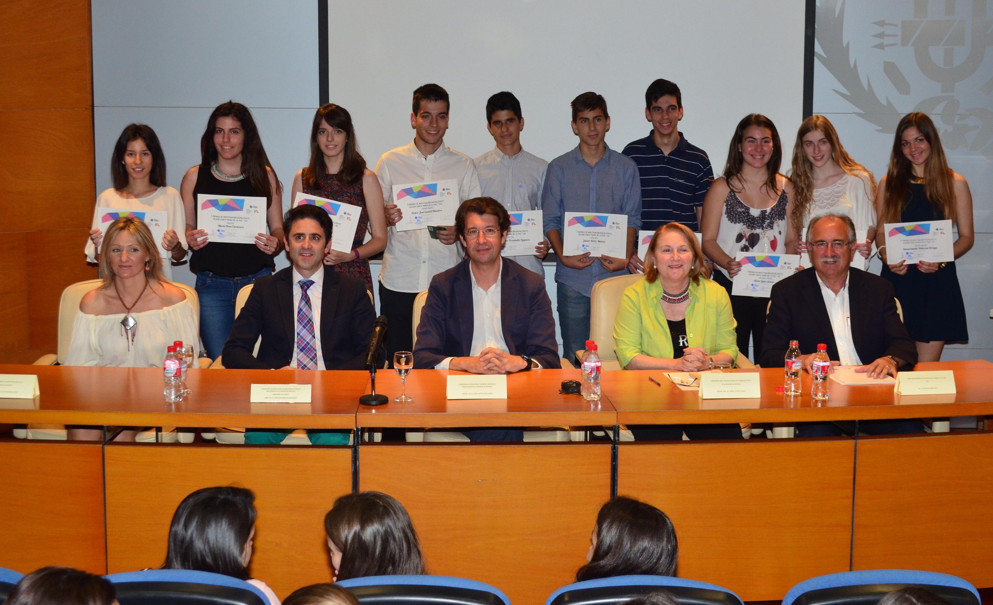 El consejero de Industria, Turismo, Empresa e Innovación, Juan Carlos Ruiz, clausuró la entrega de Premios de Investigación de Bachillerato del colegio Santa María de la Paz de Murcia, en el que también participaron la directora general de Investigación, Innovación y Sociedad de la Información, Celia Martínez Mora (1i); José Antonio Galdón Ruiz, presidente del Consejo General de la Ingeniería Técnica Industrial de España y Decano del Colegio Oficial de Ingenieros Técnicos Industriales de Murcia (2i); Isabel Tovar Zapata, presidenta del COFRM y de la Academia de Farmacia Santa María de España de la Región de Murcia (2d); y Antonio Grau, director del Colegio Santa María de la Paz-FEC (1d). En la imagen, con los ganadores de esta primera edición.