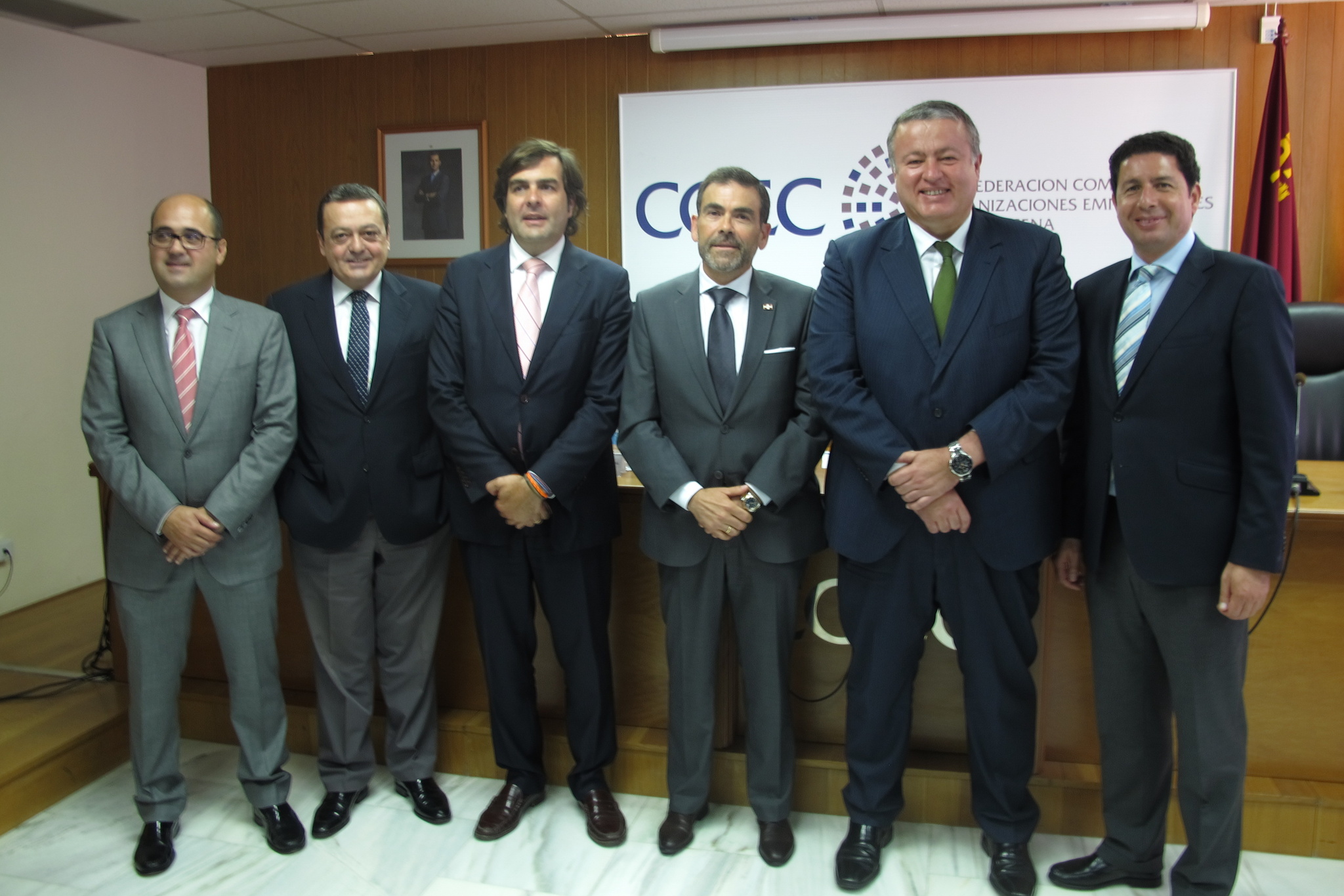 El consejero de Fomento y el presidente de COEC, junto con otras autoridades presentes en la asamblea de los empresarios de Cartagena