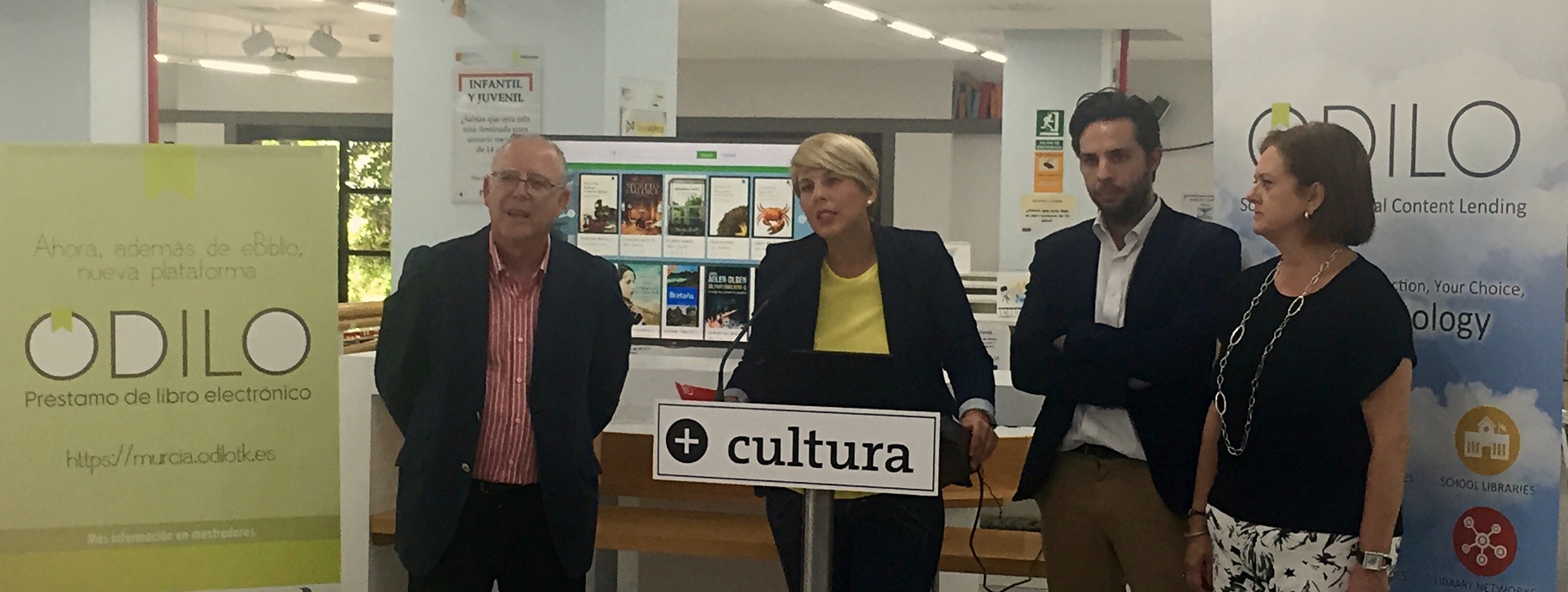 La consejera de Cultura y Portavocía, Noelia Arroyo (2i), junto al director general de Odilo, Rodrigo Rodríguez (2d); la directora general de Bienes Culturales, María Comas, y el director de la Biblioteca Regional, Antonio Prats.