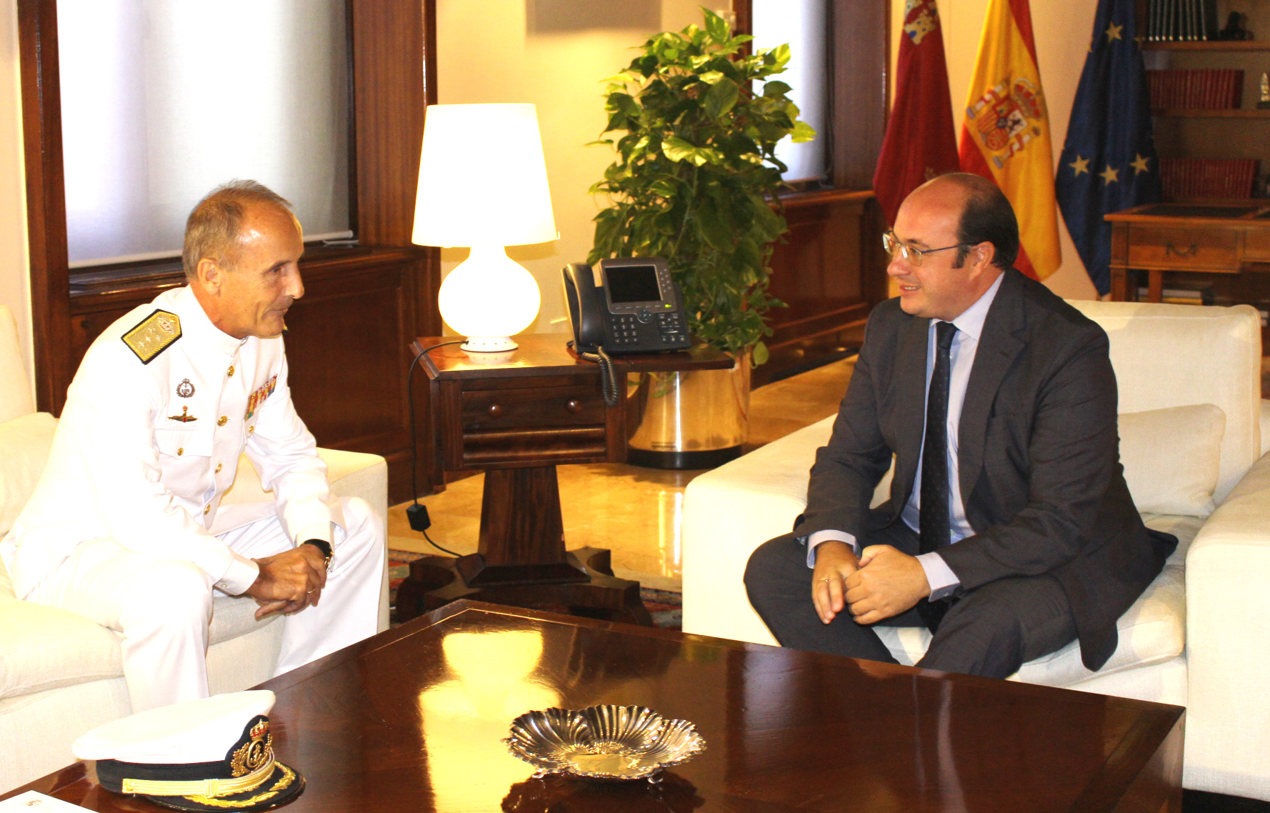 El presidente de la Comunidad, Pedro Antonio Sánchez, ha recibido hoy en el Palacio de San Esteban al almirante jefe del Arsenal Militar de Cartagena, Fernando Zumalacárregui