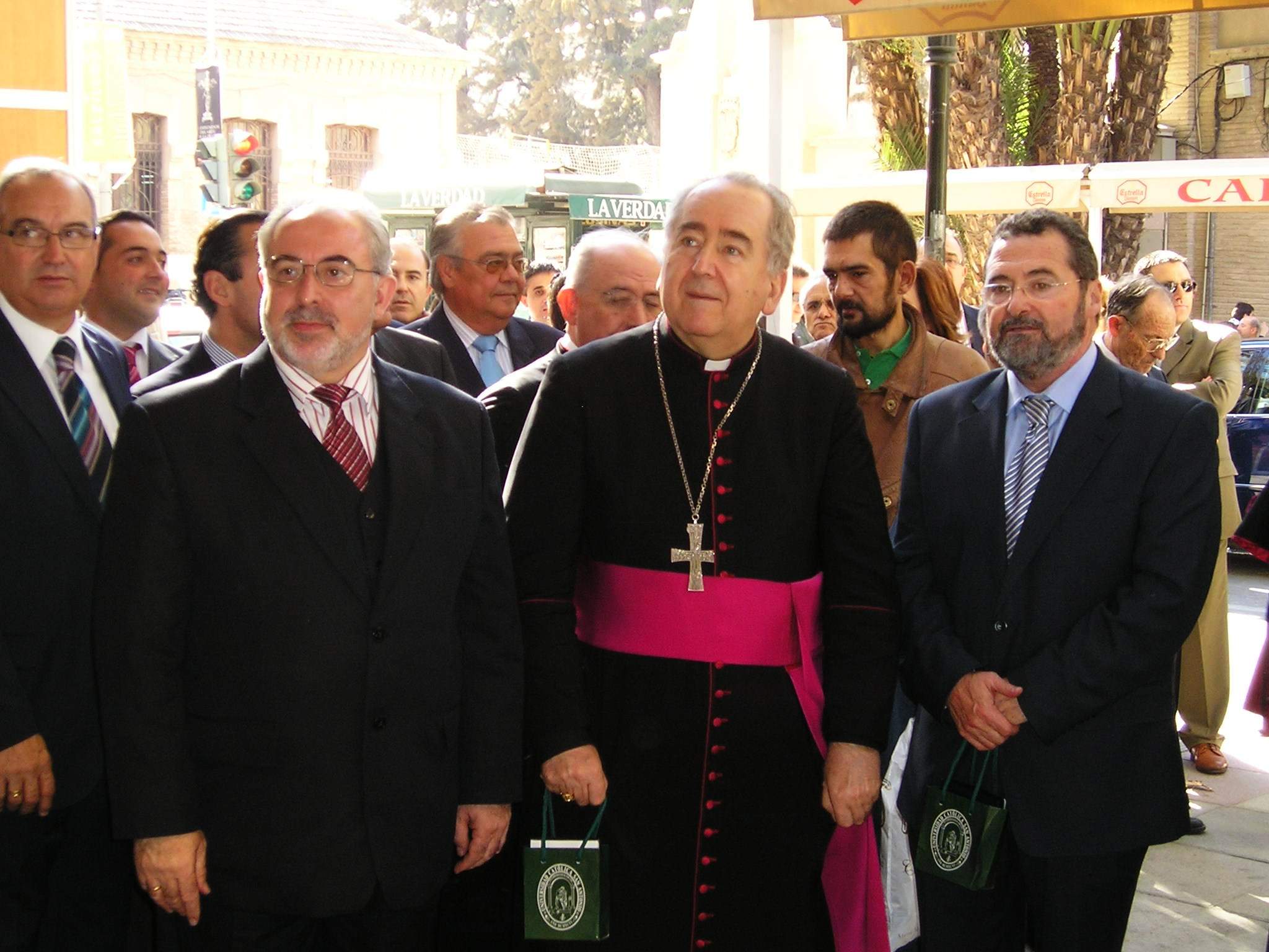 De izquierda a derecha, el presidente de la UCAM, José Luis Mendoza, el presidente del Pontificio Consejo para los Laicos, cardenal Rylko y el director general de Comercio y Artesanía, Julio José Lorenzo, durante la inauguración ayer de la Feria Cofrade en el Paseo Alfonso X de Murcia.