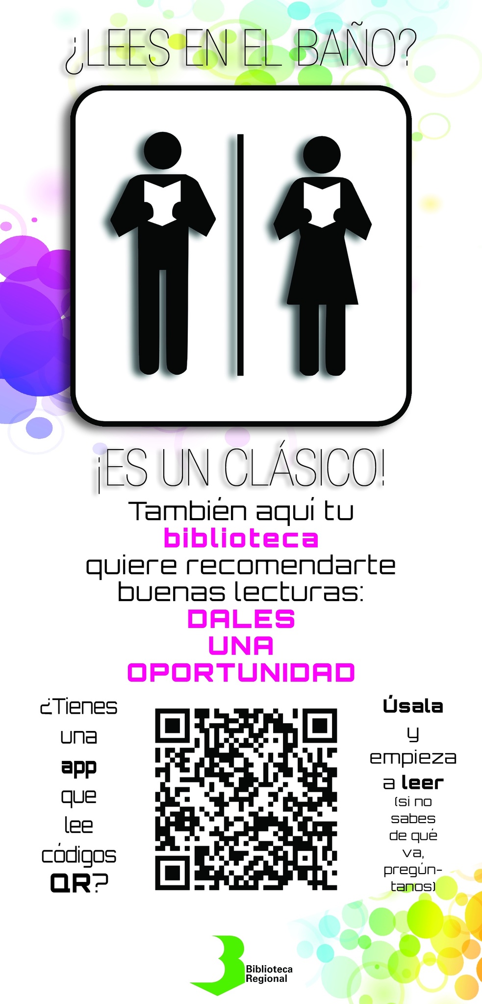 Cartel colocado en la puerta de los aseos de la Biblioteca Regional para que los usuarios puedan leer cuentos en el móvil.