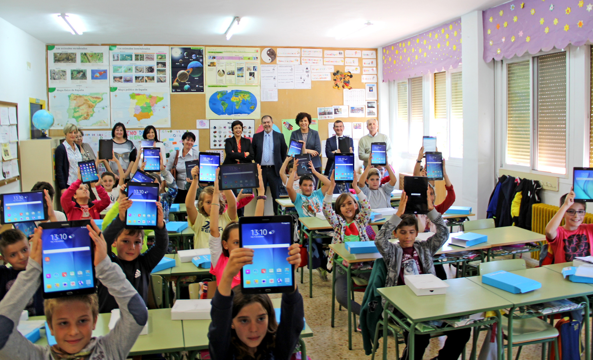 La directora general de Innovación Educativa y Atención a la Diversidad, Ana Millán; la alcaldesa de Puerto Lumbreras, María Ángeles Túnez; el director del Instituto Nacional de Tecnologías Educativas y de Formación del Profesorado, Félix Serrano; y el responsable del Área de Responsabilidad Social Corporativa de Samsung Iberia, Francisco Hortigüela, han entregado esta mañana las tabletas a los alumnos que participan en el programa ‘Samsung Smart School’ del CEIP Purísima Concepción de Puerto Lumbreras.