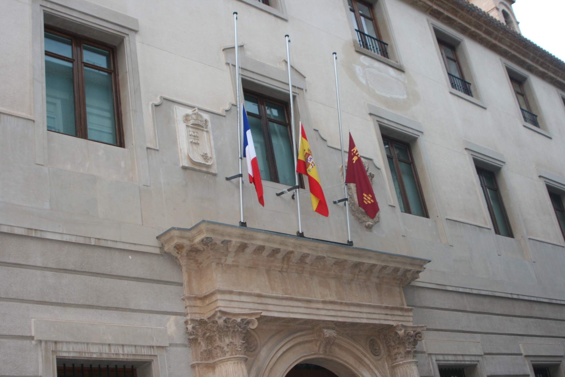Desde este mediodía en el Palacio de San Esteban, sede del Gobierno regional, ondea a media asta la bandera de Francia, junto a las de España y la Región de Murcia.