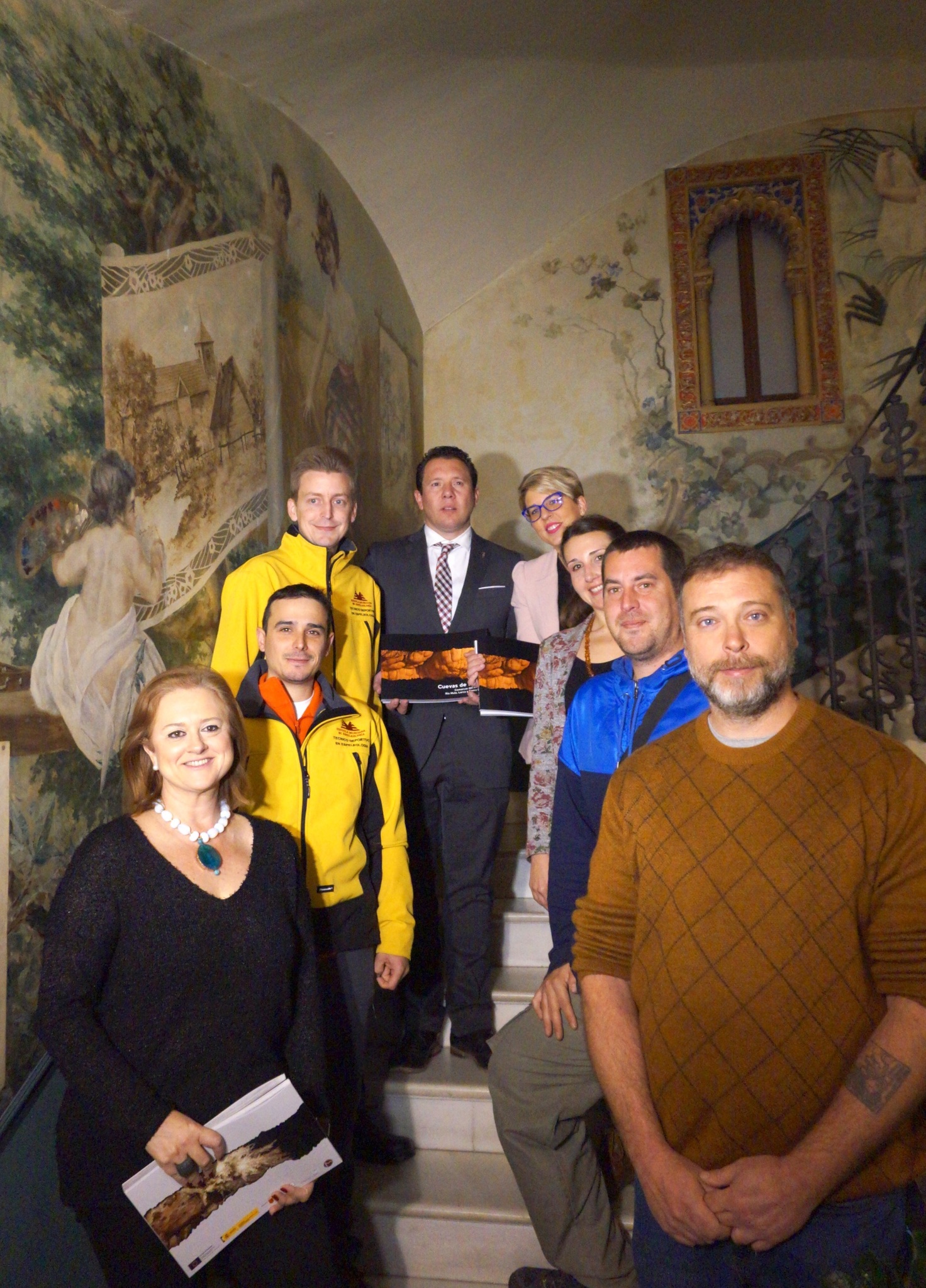La consejera de Cultura y portavoz del Gobierno regional, Noelia Arroyo, y el alcalde de Mula, Juan Jesús Moreno, junto al equipo que formó la expedición que halló las pinturas rupestres en la cueva de Yéchar.