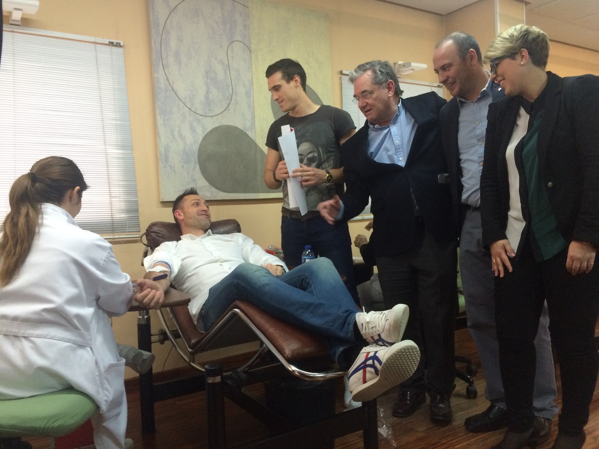 El entrenador del Real Murcia, José Manuel Aira, donando sangre en la presentación de la iniciativa