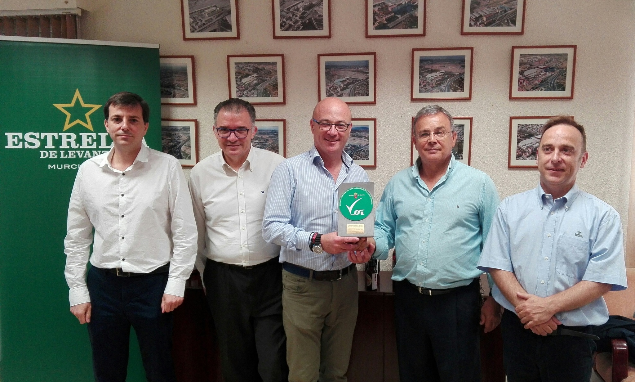 El consejero de Desarrollo Económico, Turismo y Empleo, Juan Hernández, y el director de Estrella de Levante, Patricio Valverde, acompañado de su equipo en el acto de entrega del galardón 'Empresa comprometida con la Seguridad y Salud Laboral'.