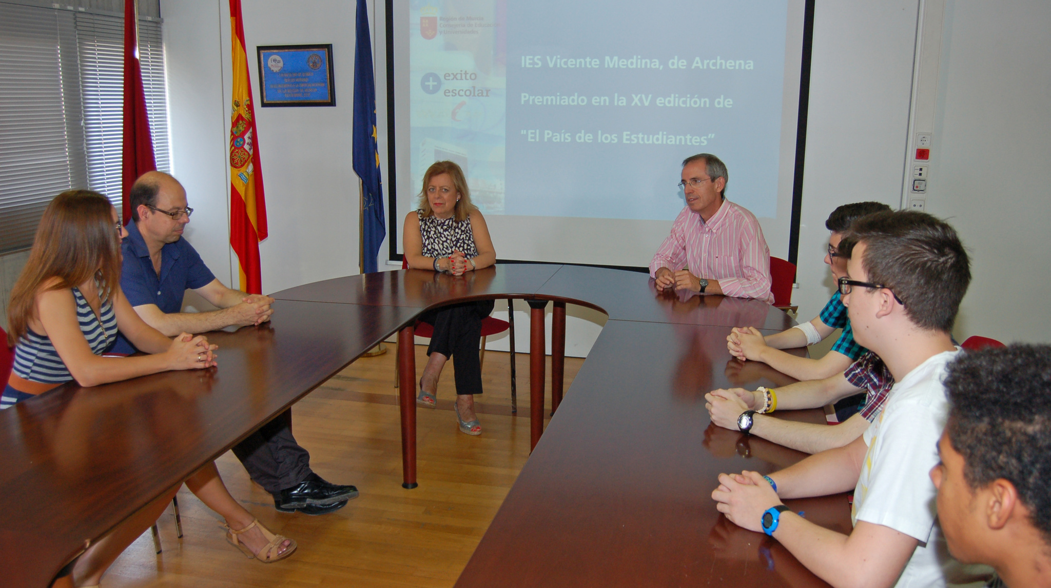 La consejera de Educación y Universidades, María Isabel Sánchez-Mora, recibió hoy a los estudiantes del Instituto de Educación Secundaria Vicente Medina de Archena que han ganado la decimoquinta edición del certamen de creación de un periódico ‘El País de los Estudiantes’, organizado por el diario El País. Estos alumnos, que cursan primero de Bachillerato, se han hecho con prestigioso premio al que se presentaron estudiantes de 1.800 centros de toda España. Sánchez-Mora les dio la enhorabuena, también a su profesora de lengua y literatura y al director del centro durante la recepción mantenida hoy en la consejería.
