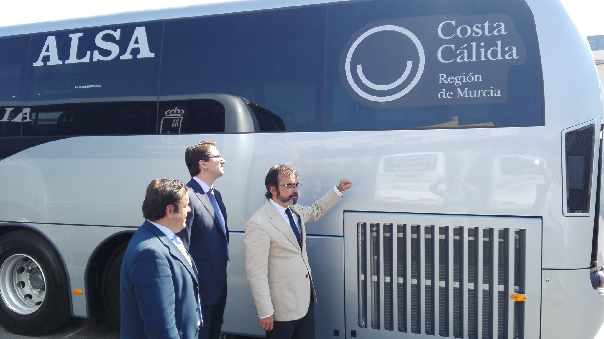 El consejero de Fomento e Infraestructuras, Pedro Rivera, acompañado por el director de ALSA en la zona mediterránea, Valeriano Díaz, y el director general de Transportes, Costas y Puertos, Salvador García-Ayllón, durante la presentación de los nuevos vehículos que modernizan la flota de la concesión que transita principalmente entre Cartagena y La Manga