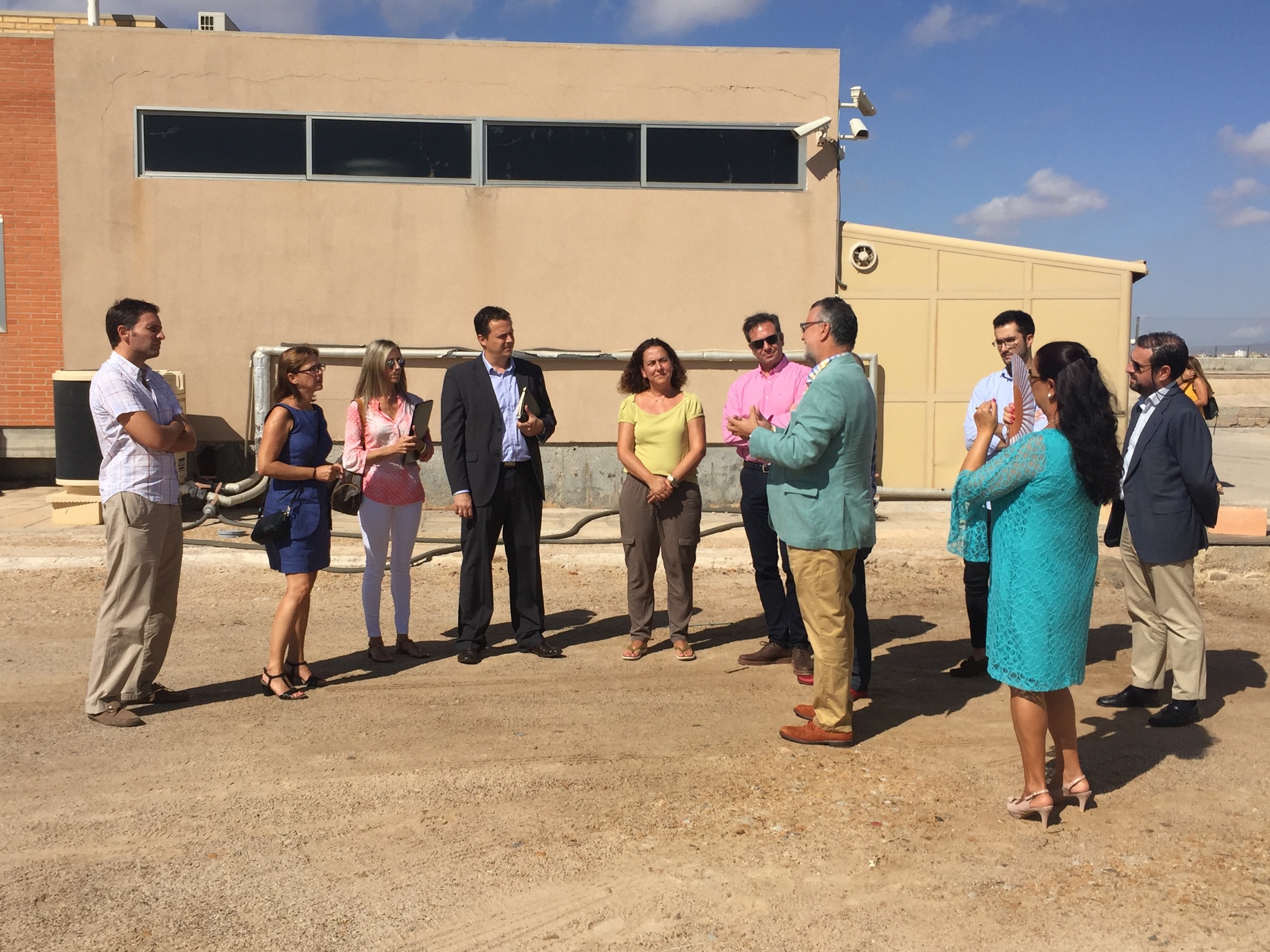 La directora general de Innovación Agroalimentaria, Juana Mulero (segunda izquierda), y el gerente de Buggypower, Pedro Escudero (cuarto derecha), junto a investigadores del proyecto visitando la zona donde se construirán los tanques para el cultivo de microalgas