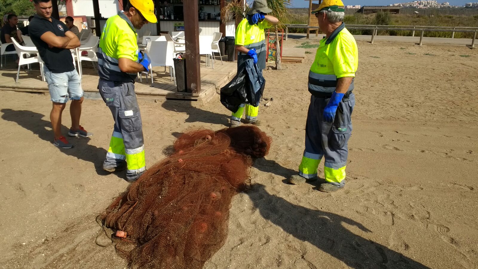 Agentes medioambientales retirando redes ilegales en la playa del Vivero.