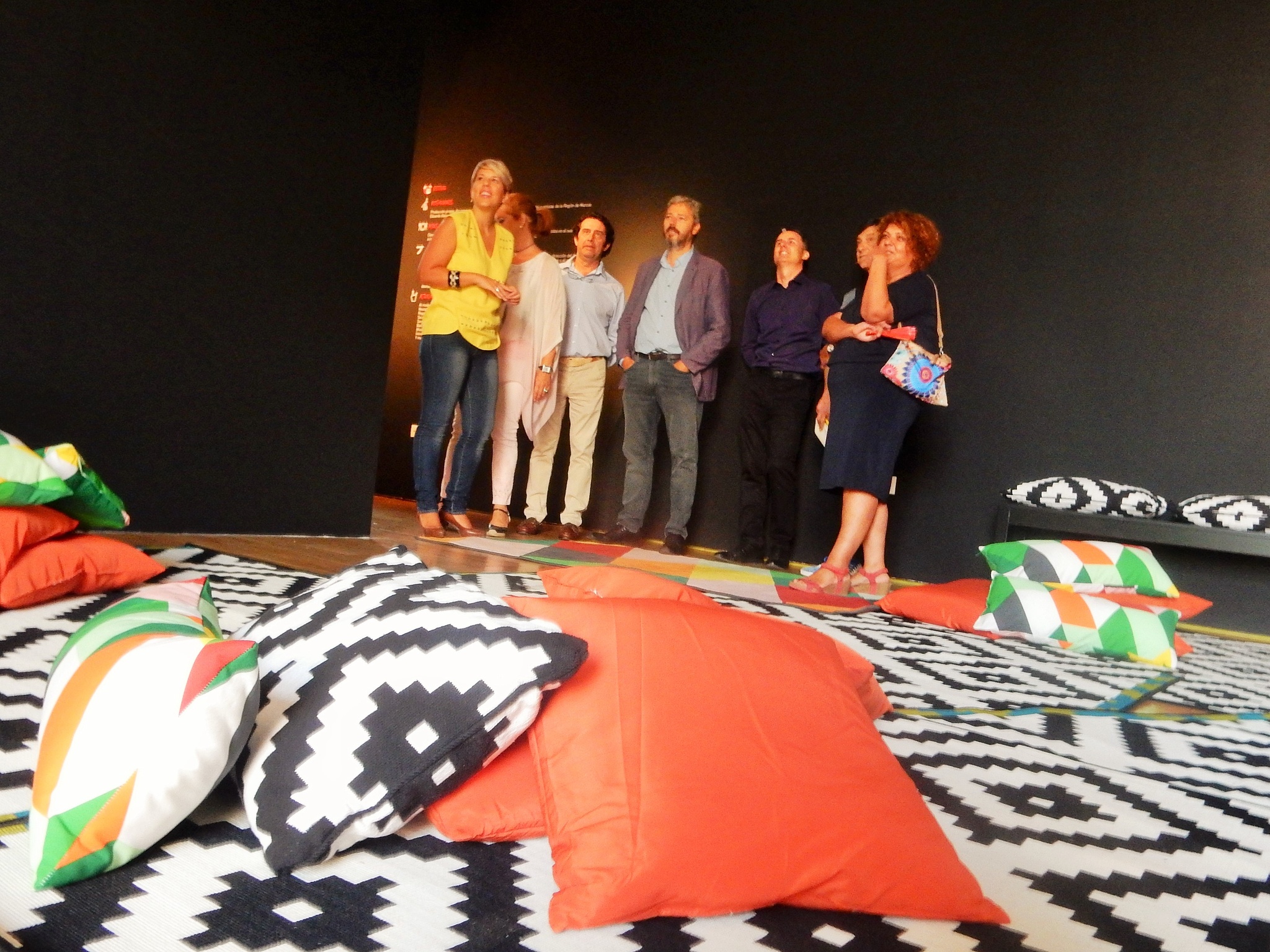 La consejera de Cultura y portavoz del Gobierno regional, Noelia Arroyo, acompañada por el director de La Verdad, Alberto Aguirre de Cárcer, y los comisarios Mara Mira y José Manuel Jiménez, vistan la exposición 'Rendibú 06 16. El arte toma los medios'