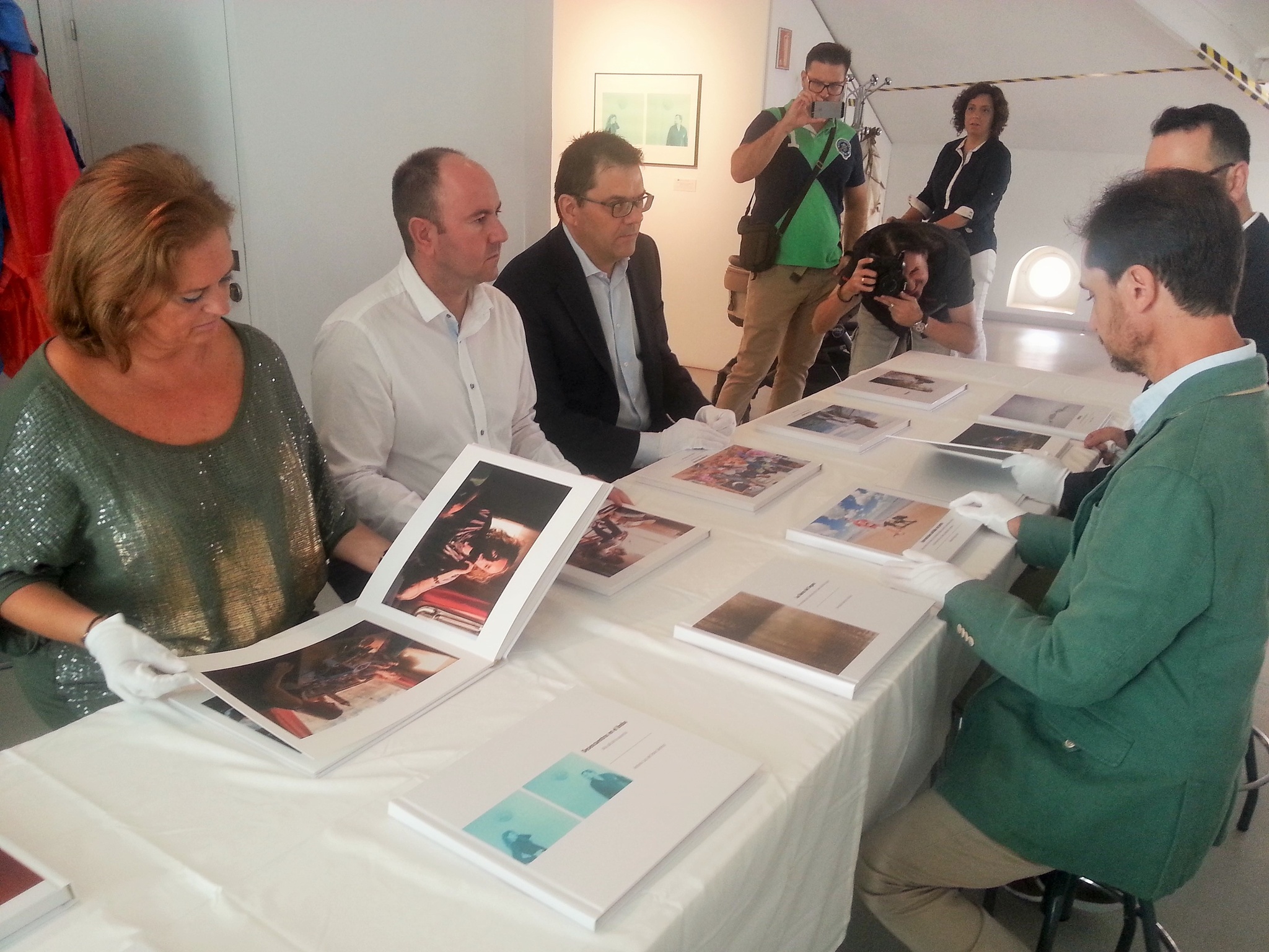 La directora general de Bienes Culturales, María Comas, junto al concejal de Cultura de Mazarrón, Pedro Martínez, el responsable de la programación del Muram, Juan García Sandoval (ambos a su lado), y los directores del Máster de Fotografía UCAM-Fotogenio, consultan algunos de los 'libros de artista' de los fotógrafos.