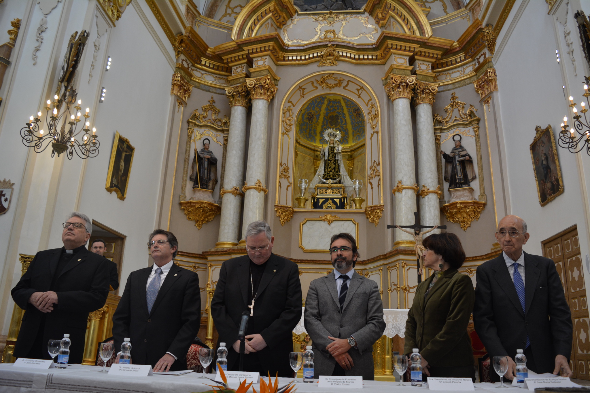 El consejero de Fomento e Infraestructuras, Pedro Rivera, el alcalde de Lorca, Francisco Jódar, el Obispo de Cartagena, José Manuel Lorca, la presidenta de la Asociación Hispania Nostra, Araceli Pereda, y el vocal y representante Europa Nostra, José María Ballester, durante el acto de entrega de las placas conmemorativas de los Premios Unión Europea de Patrimonio Cultural ‘Europa Nostra’ entregadas a seis iglesias de Lorca, galardonadas por los proyectos de recuperación llevados a cabo tras los terremotos de 2011.