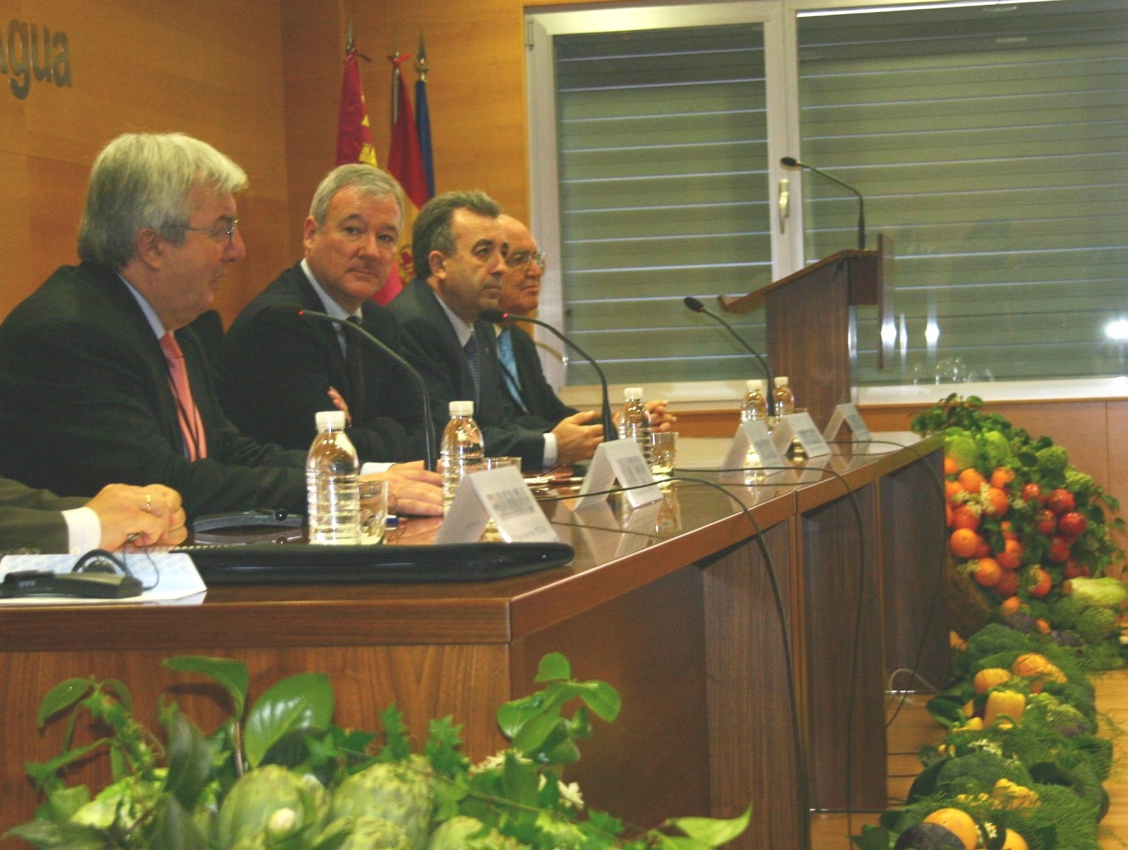 El presidente de la AREFLH, Luciano Trentini, el presidente de la Comunidad, Ramón Luis Valcárcel, el consejero de Agricultura y Agua, Antonio Cerdá, y el director para la Política Agraria Común, Joaquín Maestre (de izquierda a derecha).