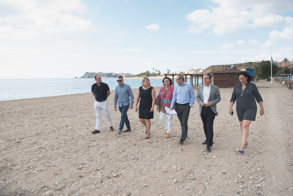 La secretaria general de la Consejería de Presidencia y Fomento, Yolanda Muñoz, la alcaldesa de Mazarrón, Alicia Jiménez, el jefe de Demarcación de Costas, Francisco Marín, y director general de Carreteras, José Antonio Fernández Lladó, analizan el proyecto de construcción de un paseo marítimo peatonal y un carril bici en la Playa del Alamillo de la localidad en el que participará la Comunidad Autónoma.