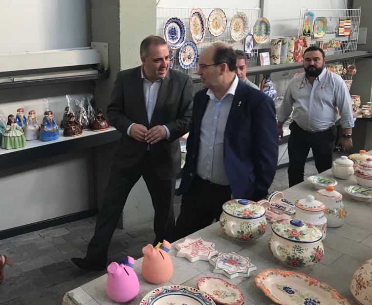 Con motivo del partido que esta noche juega el Fútbol Club Cartagena y el Sevilla F.C. en Cartagena, el presidente del Sevilla, José Castro Carmona, junto al director general de Comercio, Consumo y Simplificación Administrativa, Francisco Abril, ha visitado el Centro Regional de Artesanía de Murcia.