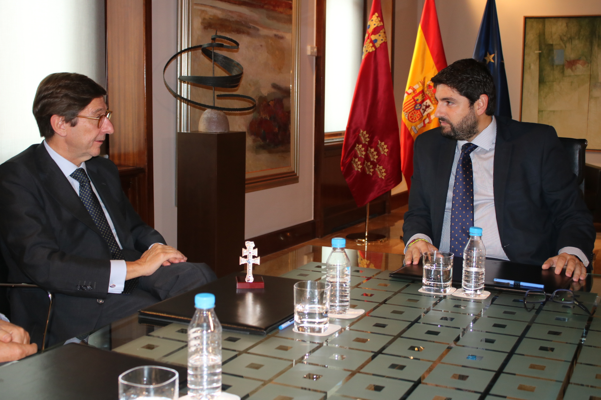 El presidente de la Comunidad, Fernando López Miras, se reunió hoy en el Palacio de San Esteban con el presidente de Bankia, José Ignacio Goirigolzarri, y el presidente del Banco Mare Nostrum (BMN), Carlos Egea, dos entidades que completarán su fusión en el mes de diciembre.