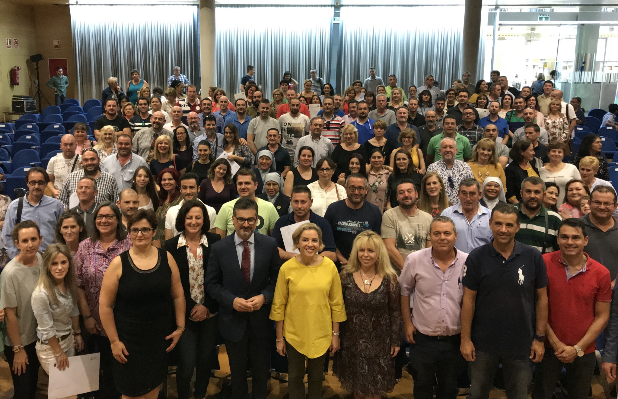 La consejera de Educación, Juventud y Deportes, Adela Martínez-Cachá, junto al director general de Formación profesional y Enseñanzas de Régimen Especial, Sergio López, y a los alumnos que consiguieron acreditar su competencia profesional gracias a la última convocatoria de reconocimiento de competencias en la Región de Murcia (PREAR).