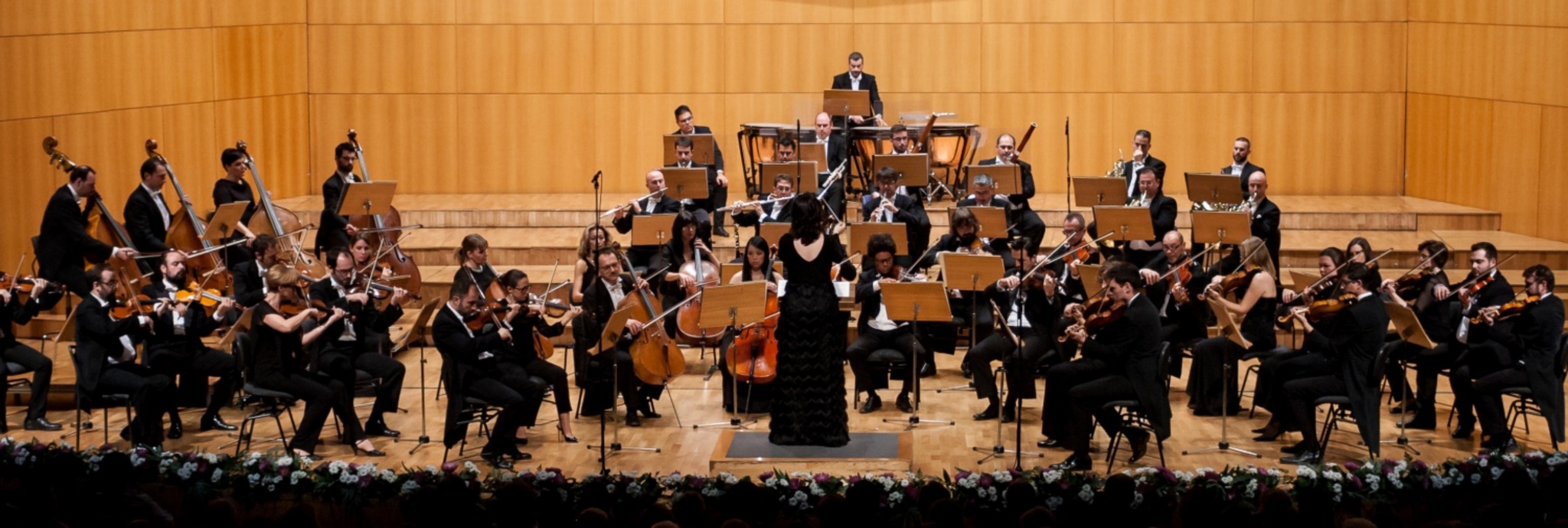 Los miembros de la Sinfónica de la Región, junto a la directora de orquesta Virginia Martínez, durante uno de sus conciertos.